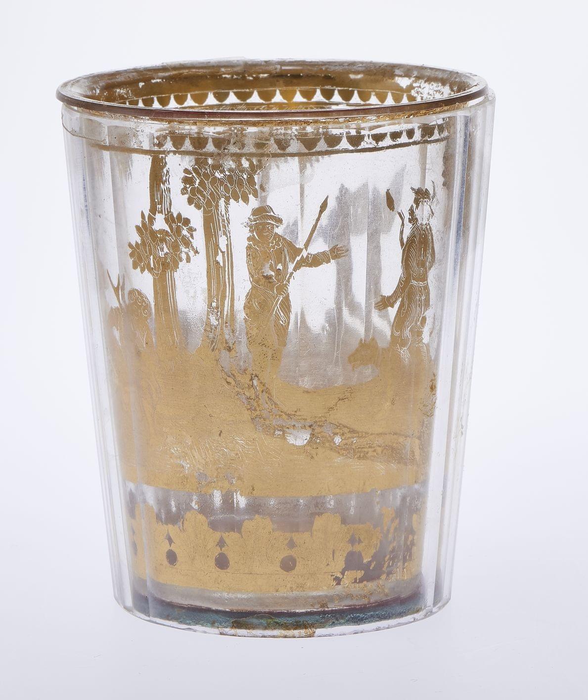 830. 3 grands verres à vin à décor gravé de fleurs, armoiries et méda...