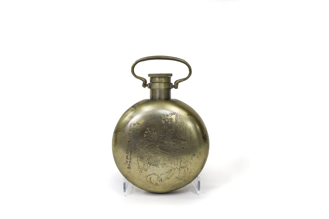 Laiton à décor d'une scène animée et d'une inscription, H 13 cm