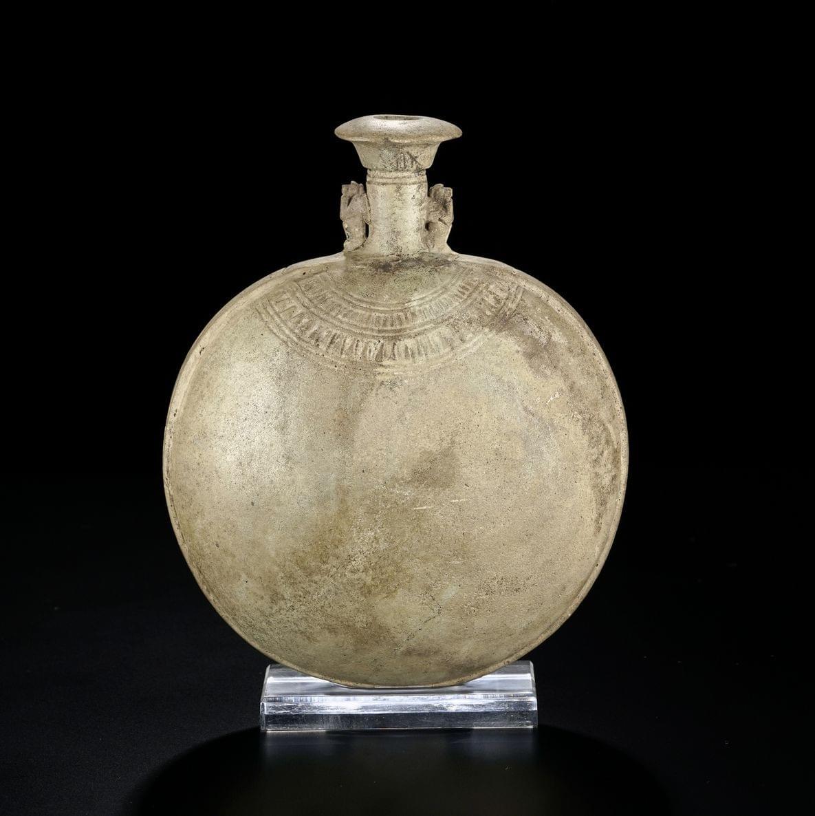 An egyptian pale green glazed composition new zear's flask, late dynastic period. Provenance: Swiss private collection