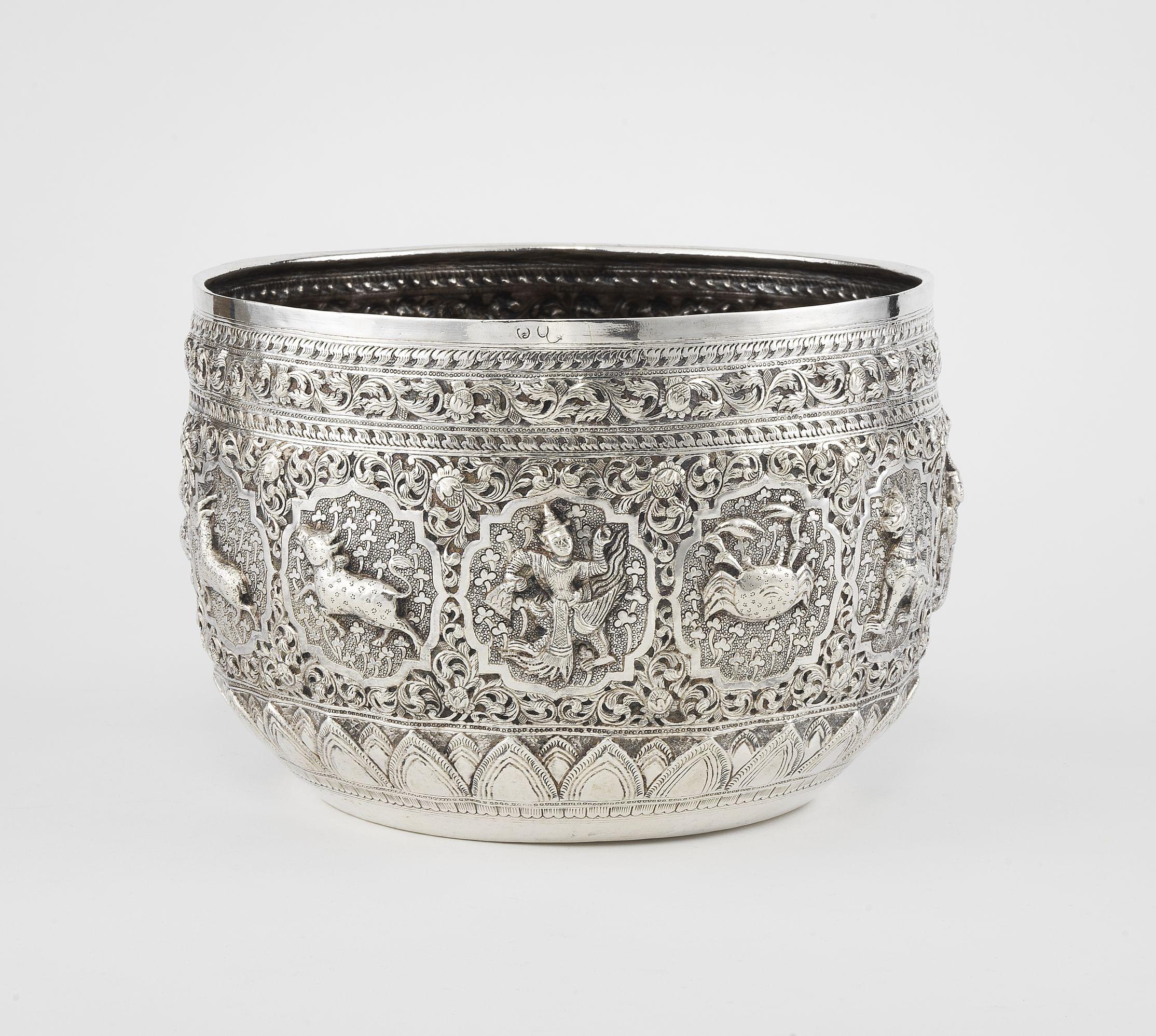 105. Bol à punch sur talon à décor repoussé de rinceaux et oiseaux