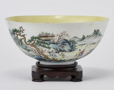 Porcelaine coquille d'œuf, émaillée polychrome à décor d'une scène animée dans un paysage, intérieur monochrome jaune, D 21 cm