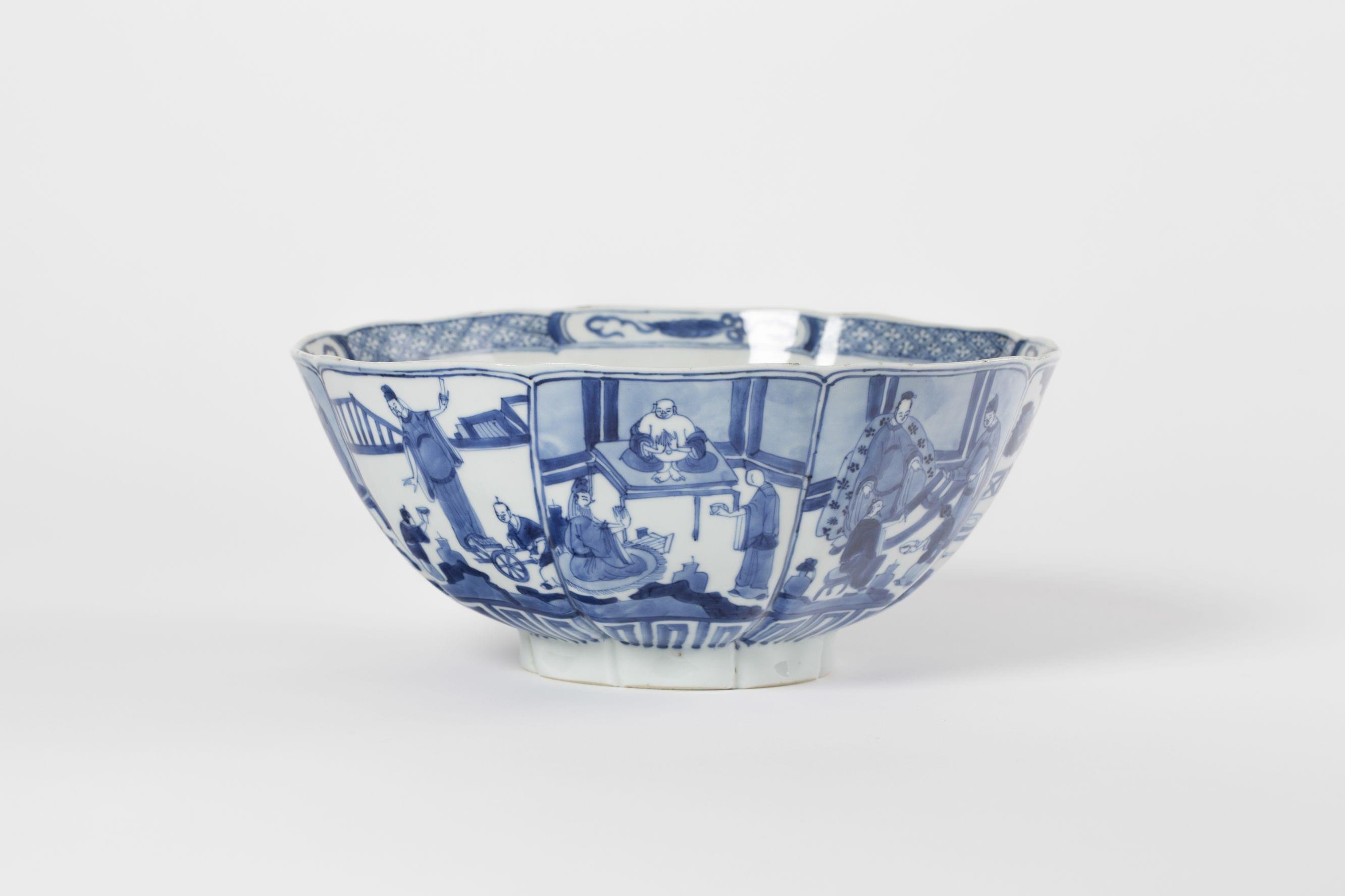 Porcelaine bleu blanc à décor de scènes de cour, D 24 cm