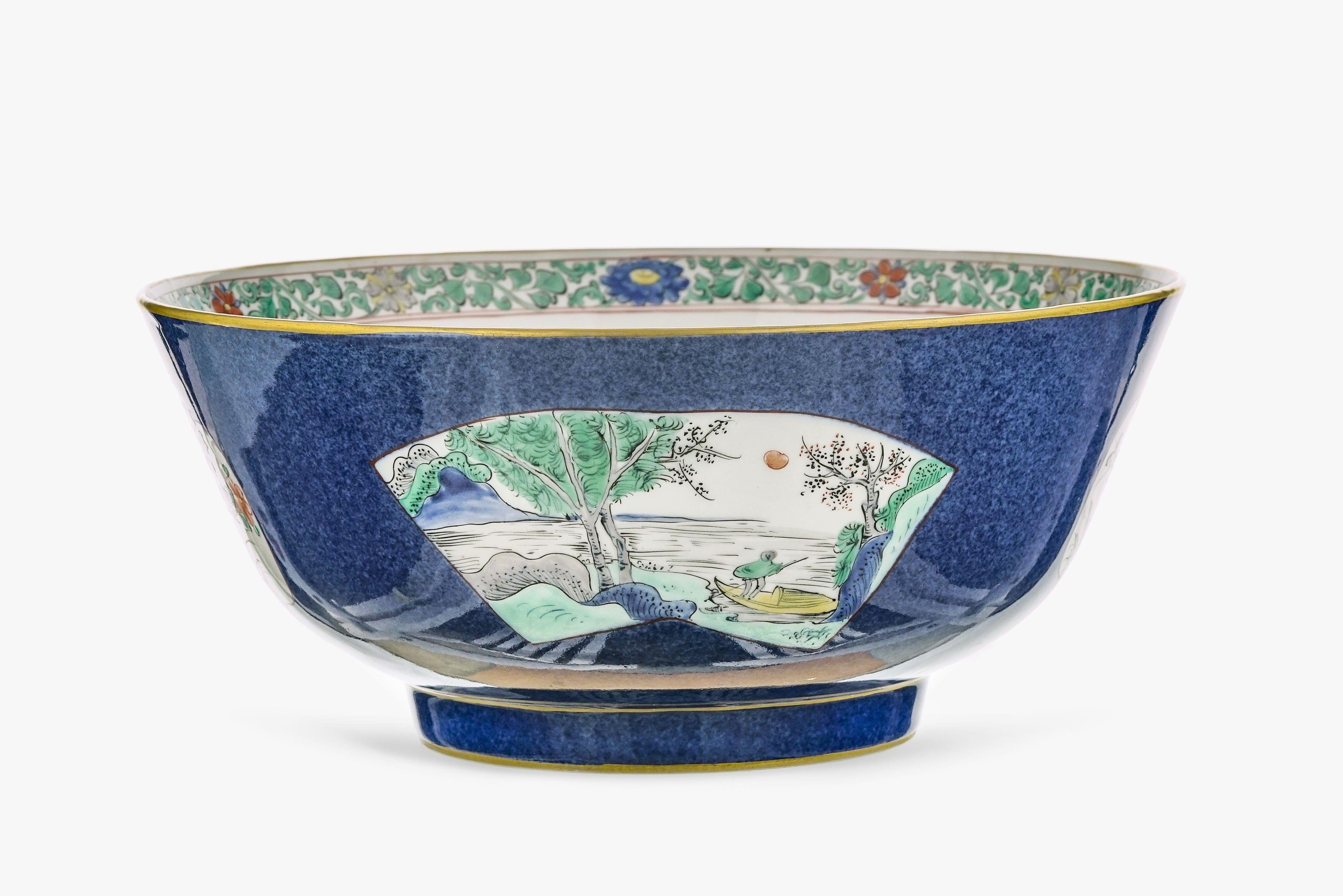 Porcelaine à décor émaillé polychrome en réserve sur fond bleu poudré, D 25 cm
