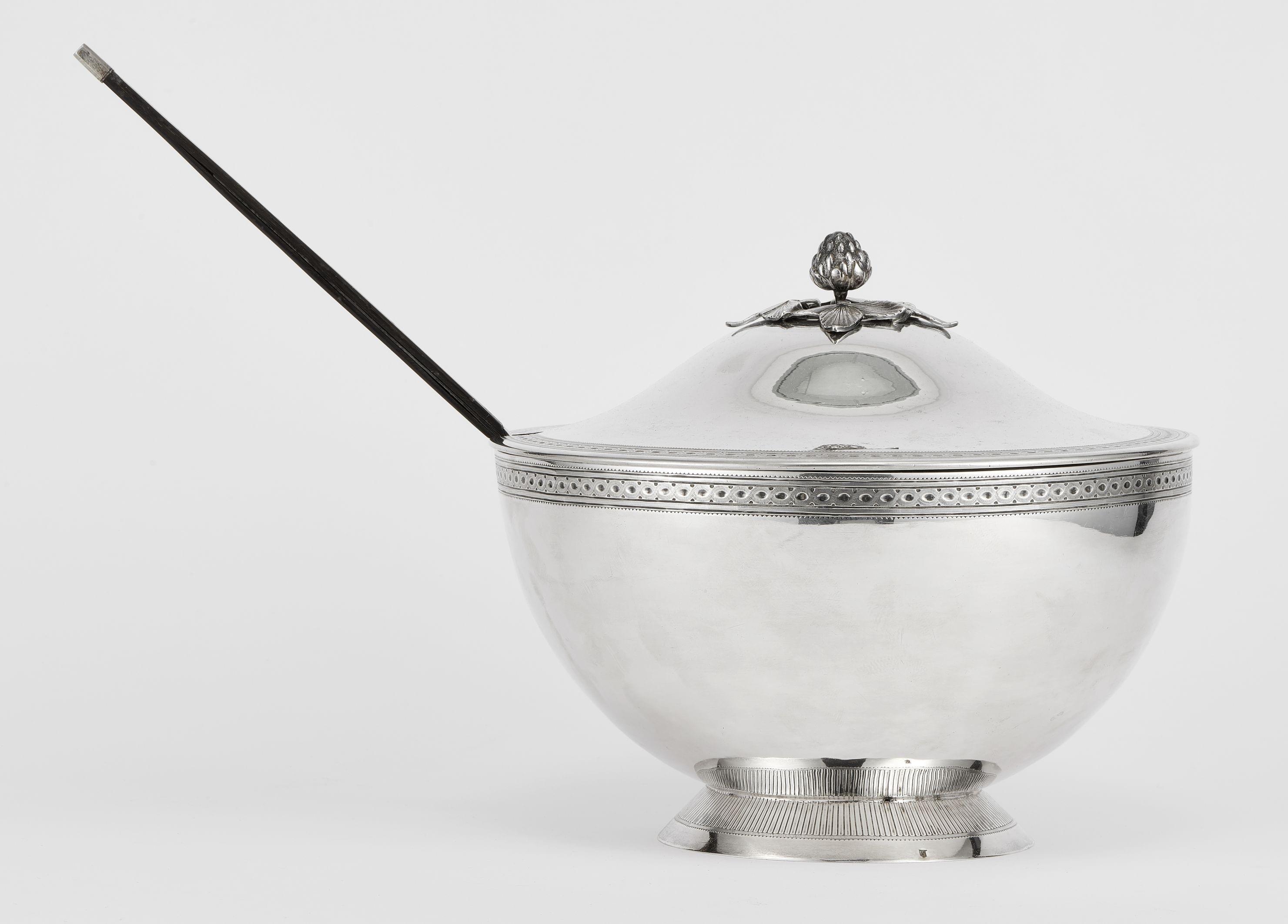 Philippe Vernet, Lausanne deuxième moitié du XVIIIe s, couvercle assorti à fretel en fraise postérieur, D 22,5 cm, 1050g. On joint une louche à punch, Papus Dautun, Lausanne XVIIe s, argent et fanon de baleine, 70 g.