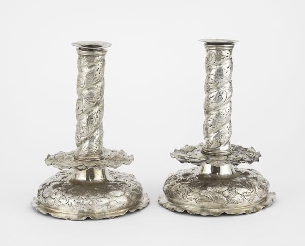 1. Paire de flambeaux à décor repoussé de larges fleurs et acanthes