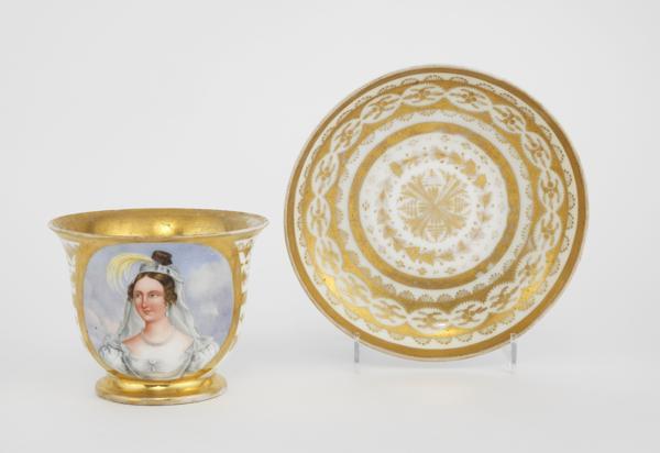 4. Tasse blanche et or à décor en médaillon d'une jeune femme