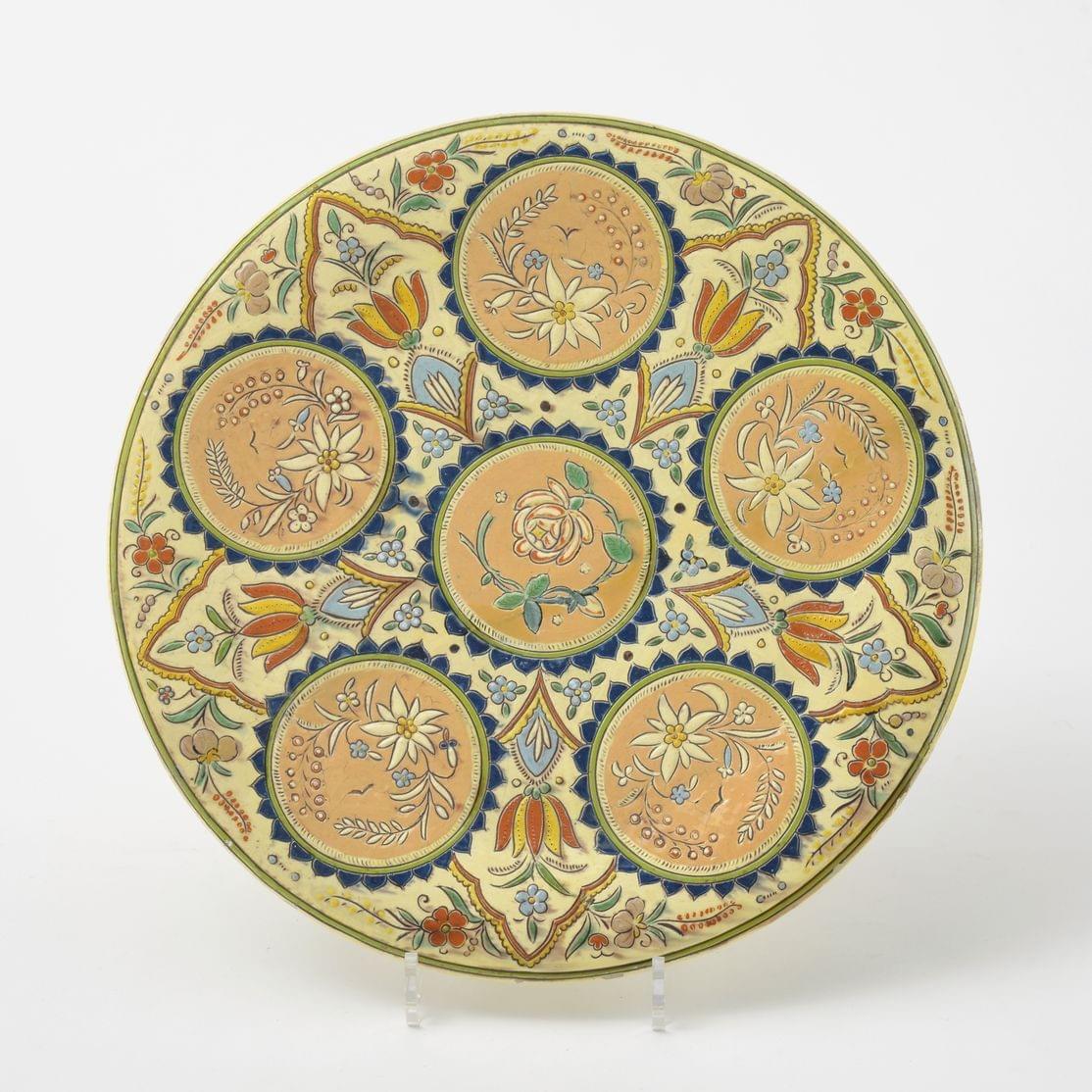 Terre vernissée à décor de 5 médaillons comprenant une rose et des edelweiss entourés de motifs floraux et géométriques, fond crème, signature Thoune, D 36,5cm.