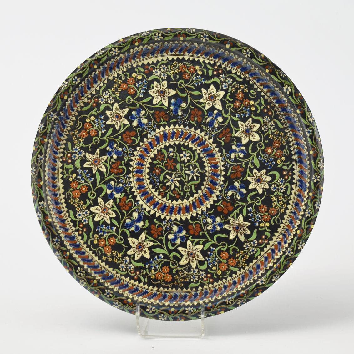 Terre vernissée à décor incisé de frises de motifs géométriques et floraux alternés, émaux polychromes, fond noir, non signé, D 43 cm.