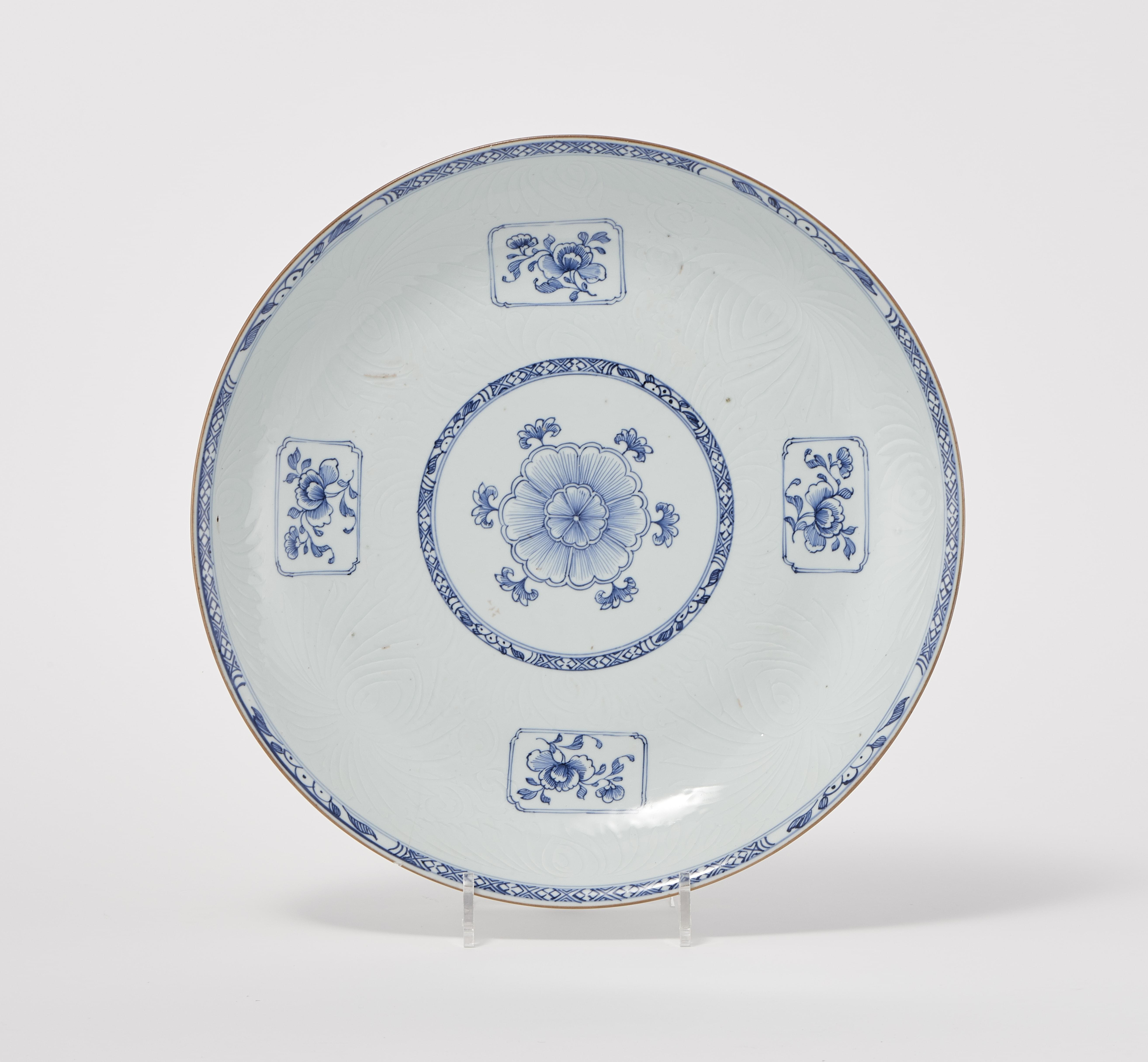 Porcelaine émaillée bleu blanc, cercles de laiton, D 26 cm