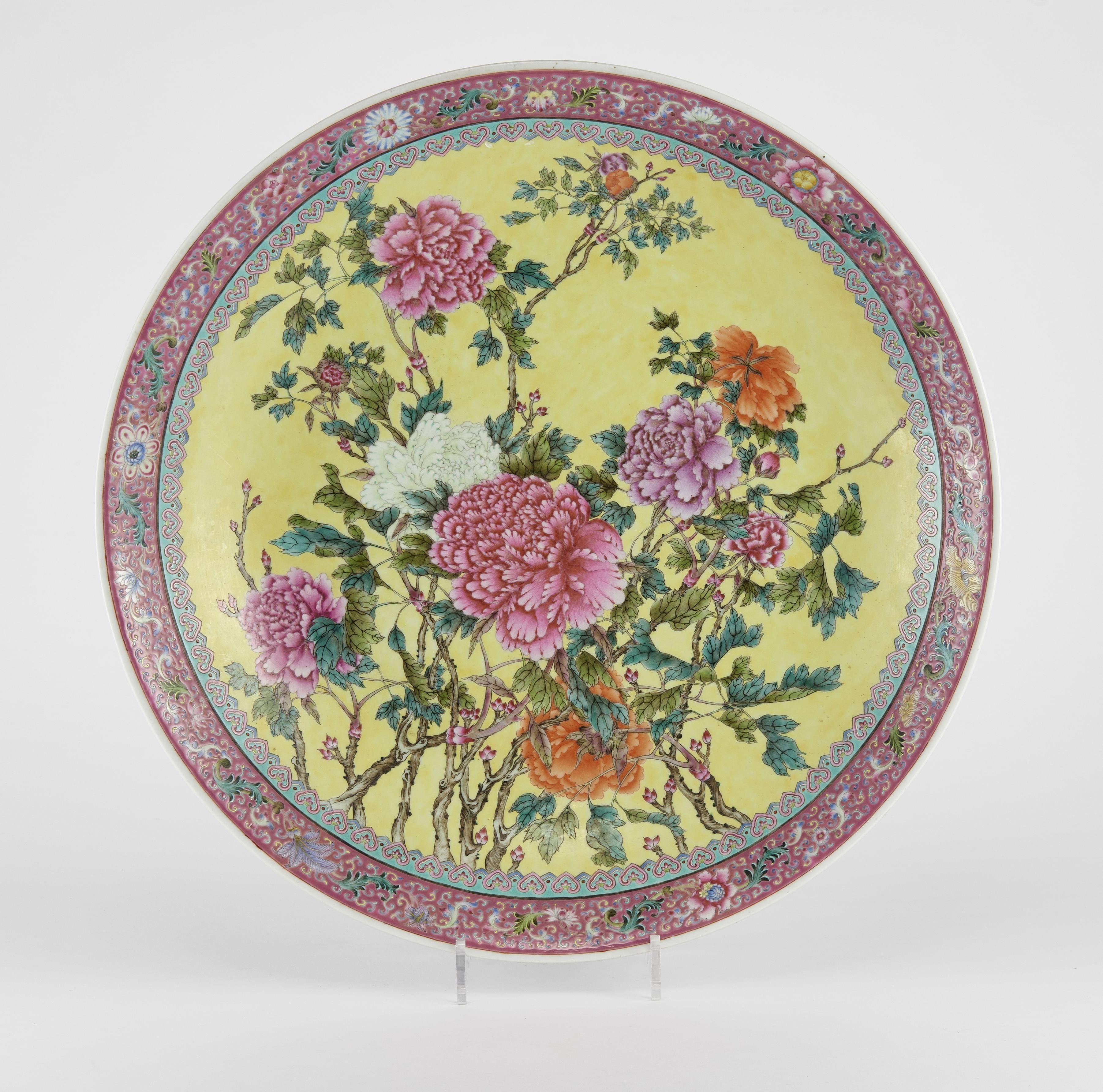 Porcelaine émaillée polychrome à décor de pivoines sur fond jaune, D 46 cm
