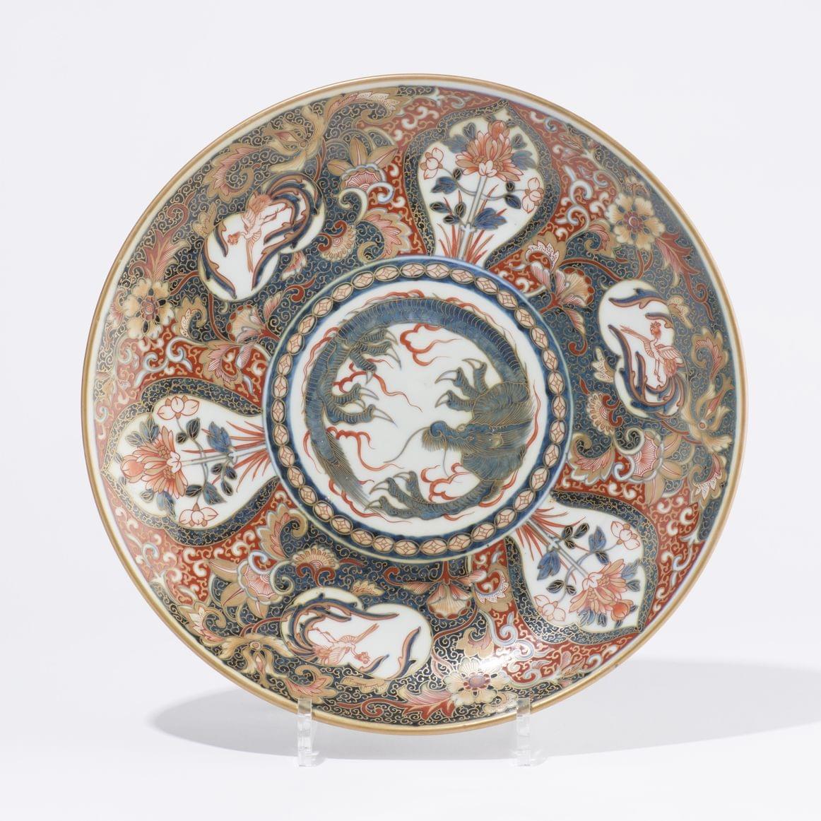 Porcelaine à décor polychrome d'un dragon entouré de fleurs et de phénix, marque Fuki Choshun, Japon, époque Meiji (1868-1912), D 31 cm