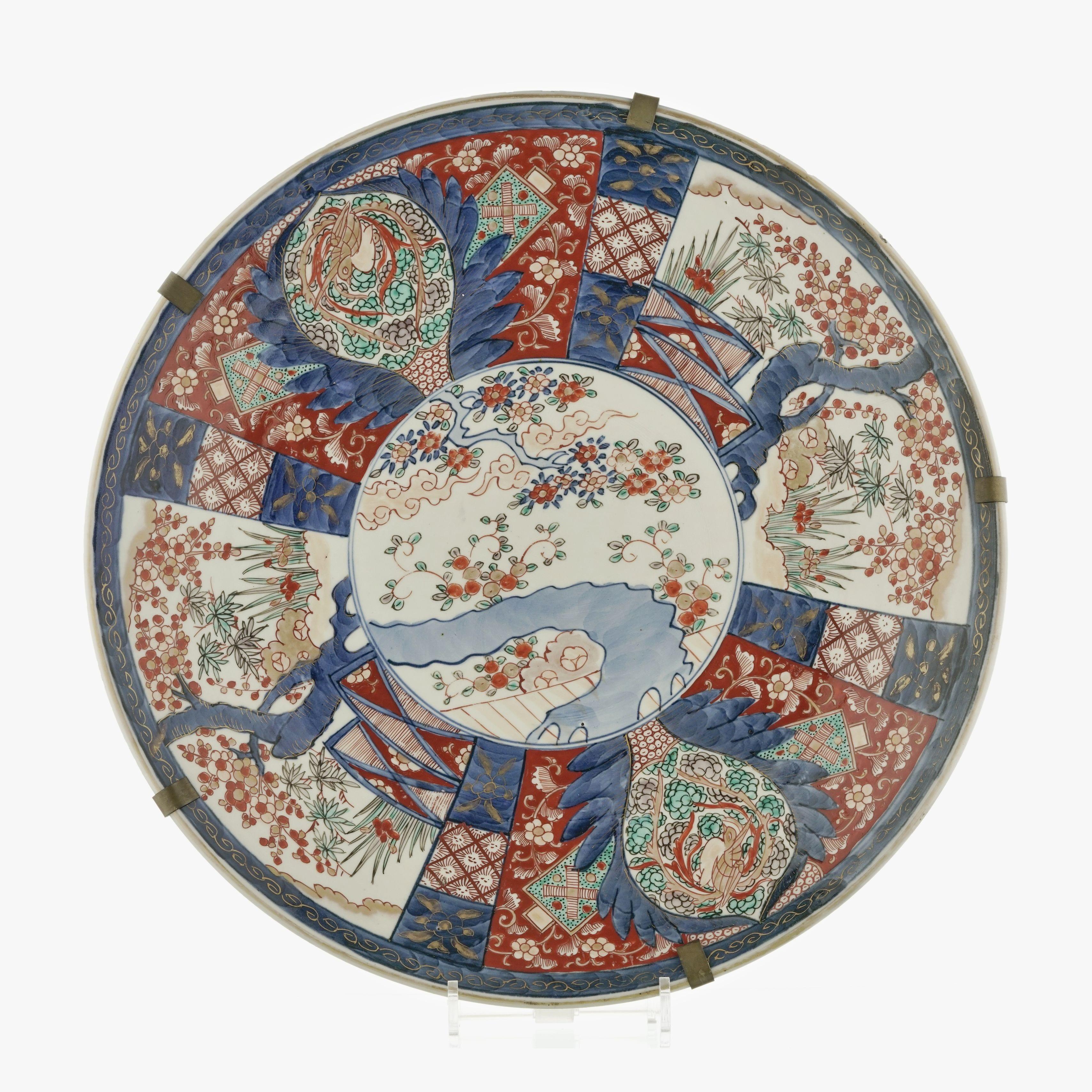 Porcelaine émaillée bleu, rouge, vert et or à décor en réserves de motifs végétaux sur fond bleu, D 45,5 cm