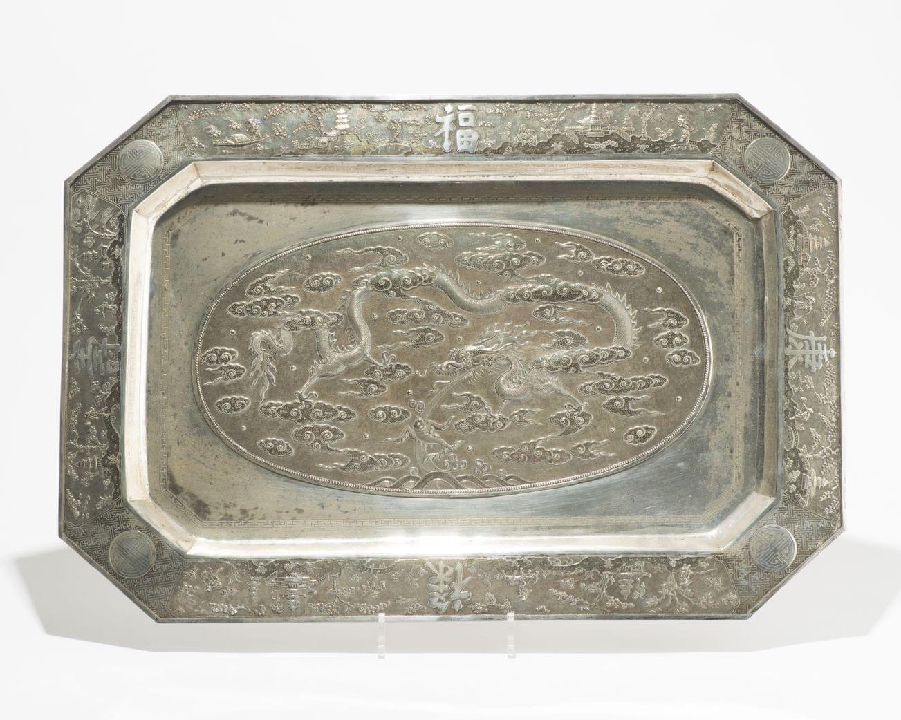 A décor en léger relief de scènes animées et d'un dragon dans des nuées, Argent, 60x41 cm, 2780 g