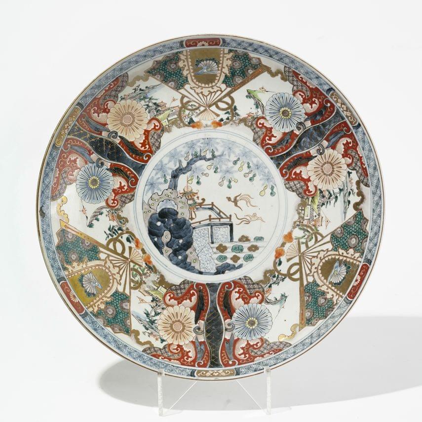 Porcelaine émaillée polychrome à décor d'éventails sur fond de paysages, D 47 cm