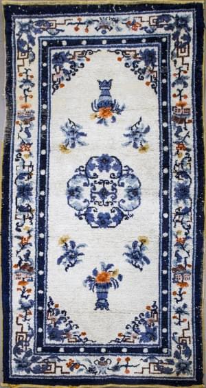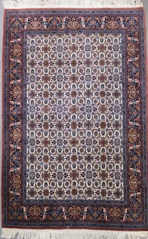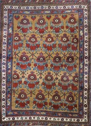 A décor de vases fleuris en semi sur fond ocre, laine, 139x178 c...