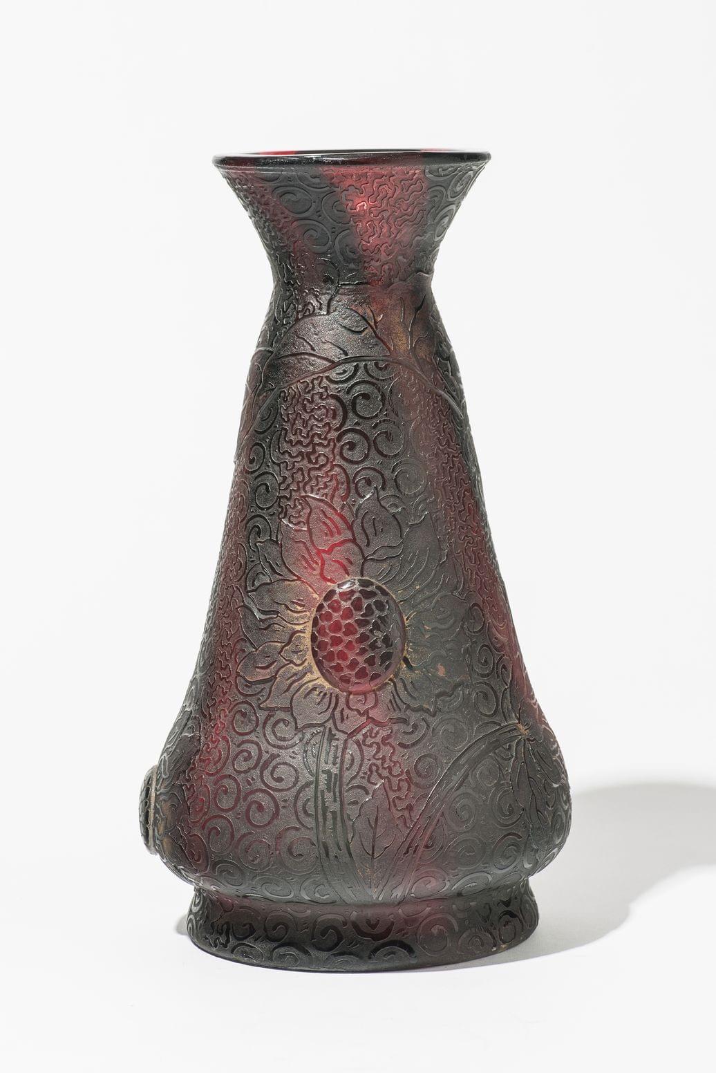 Verre marbré rouge et vert anciennement doré à décor dégagé à l'acide de tournesols sur fond vermiculé, H 40 cm