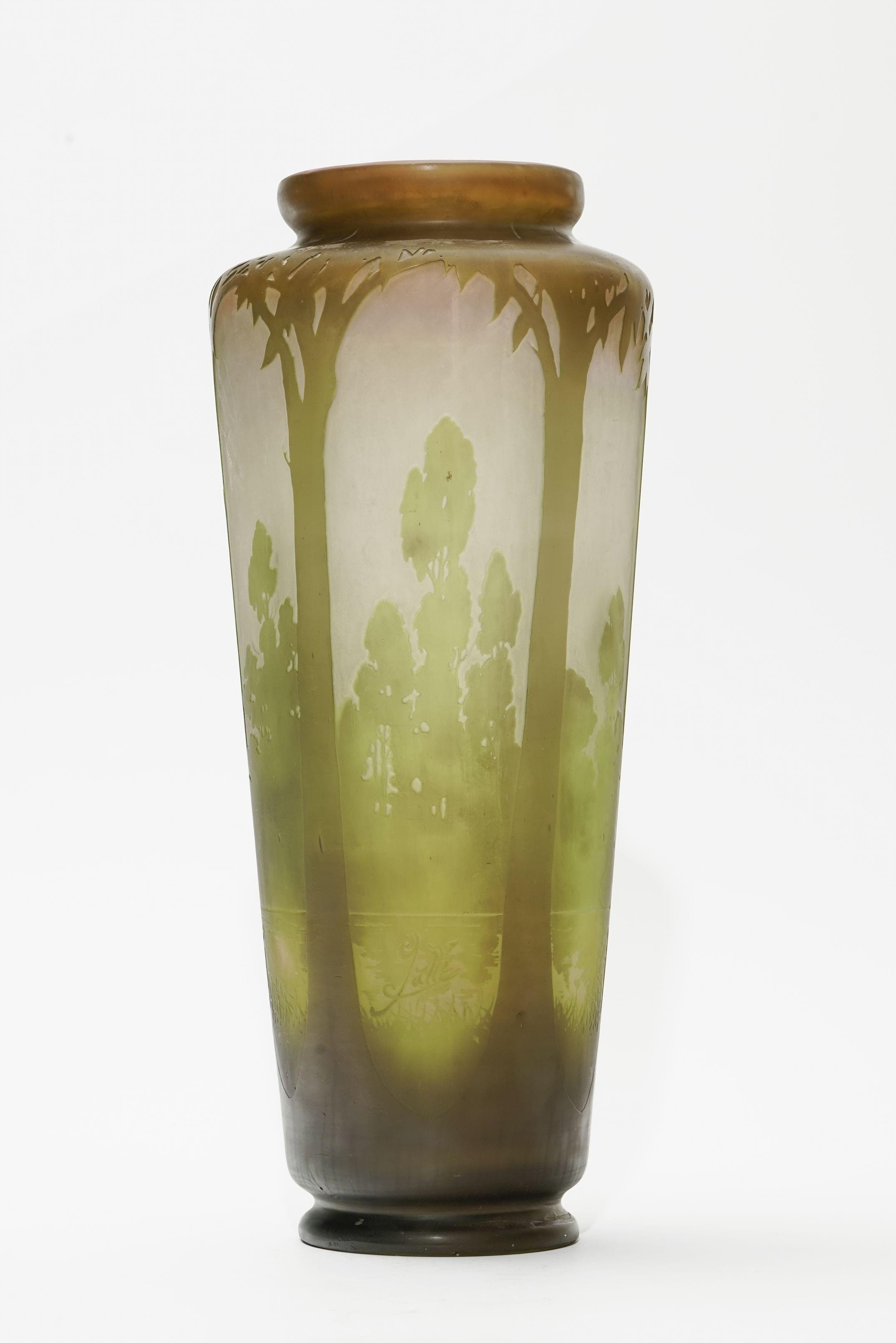 Verre multicouche dégagé à l'acide à décor d'un paysage lacustre et de silhouettes d'arbres, H 48 cm