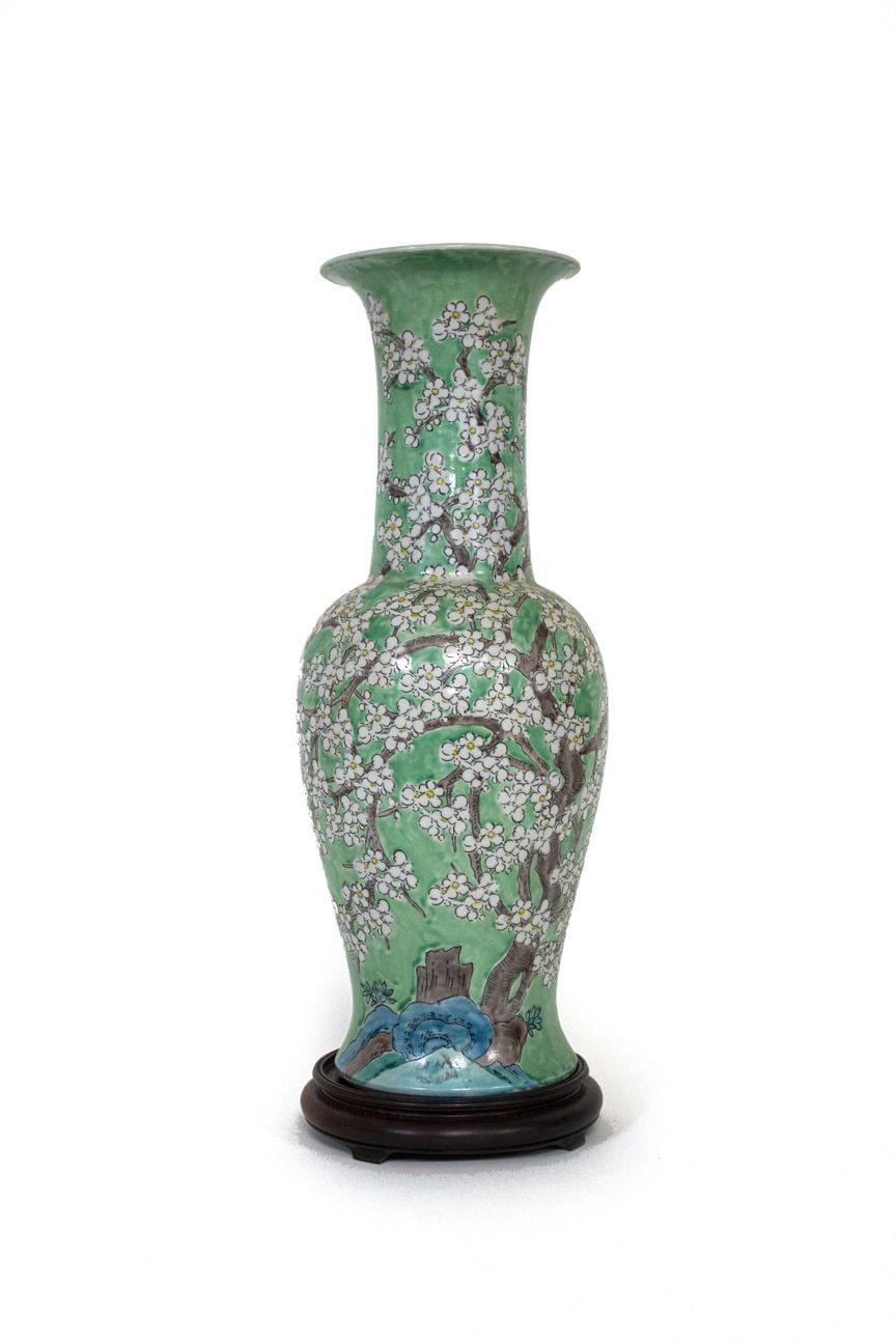 Porcelaine émaillée à décor de branches de prunus sur fond vert, H 47 cm