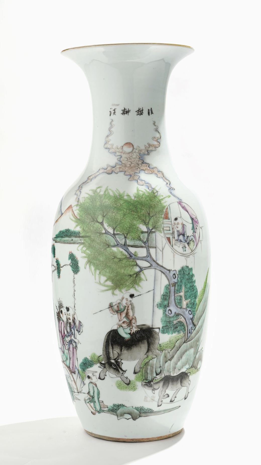 Porcelaine émaillée polychrome à décor d'enfants jouant avec des buffles et poème, H 57 cm