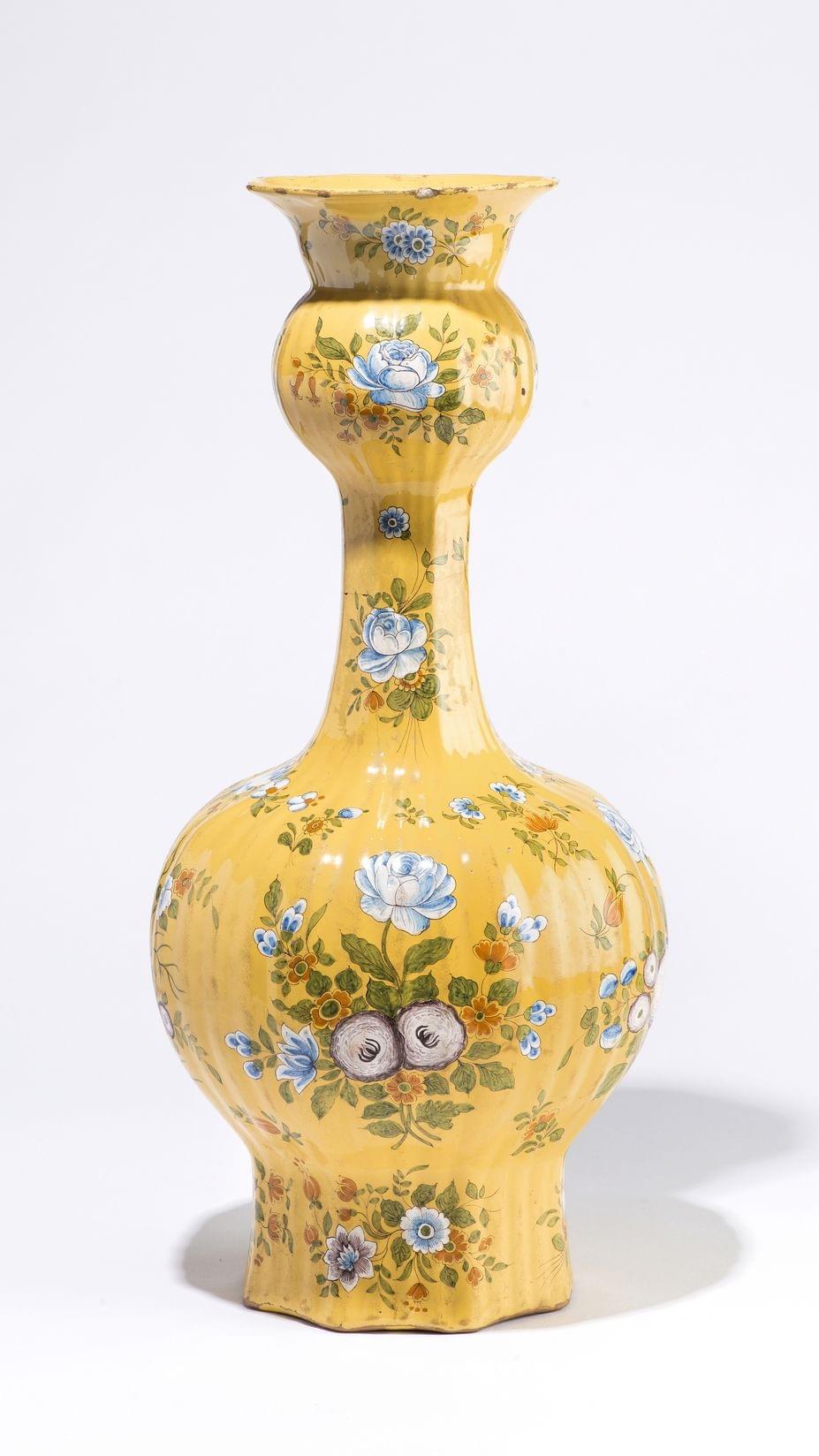 Faïence émaillée polychrome à décor de fleurs sur fond jaune, H 61 cm