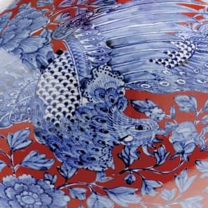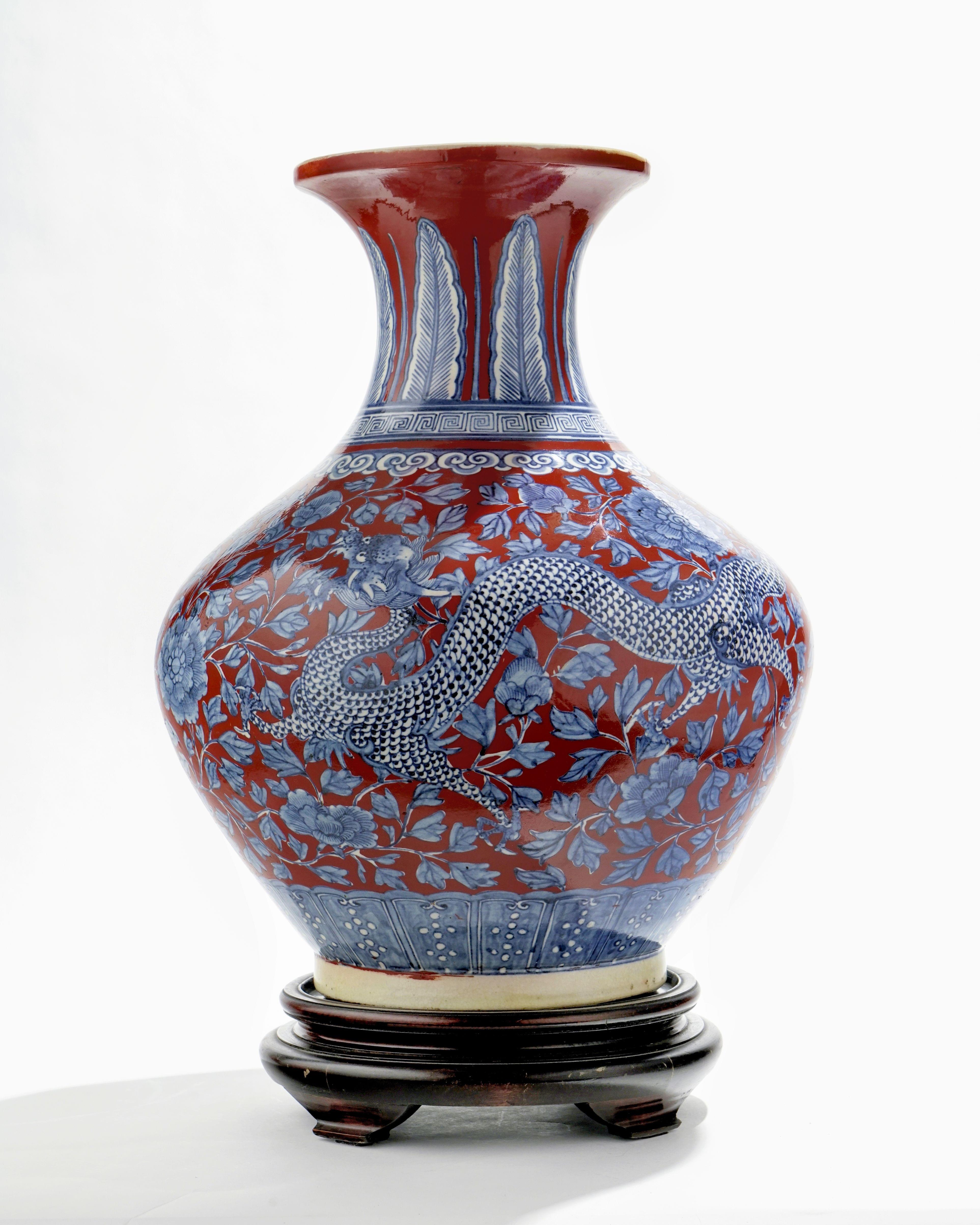 Porcelaine émaillée bleu, rouge et blanc à décor d'un dragon et d'un phénix dans des pivoines, H 49 cm