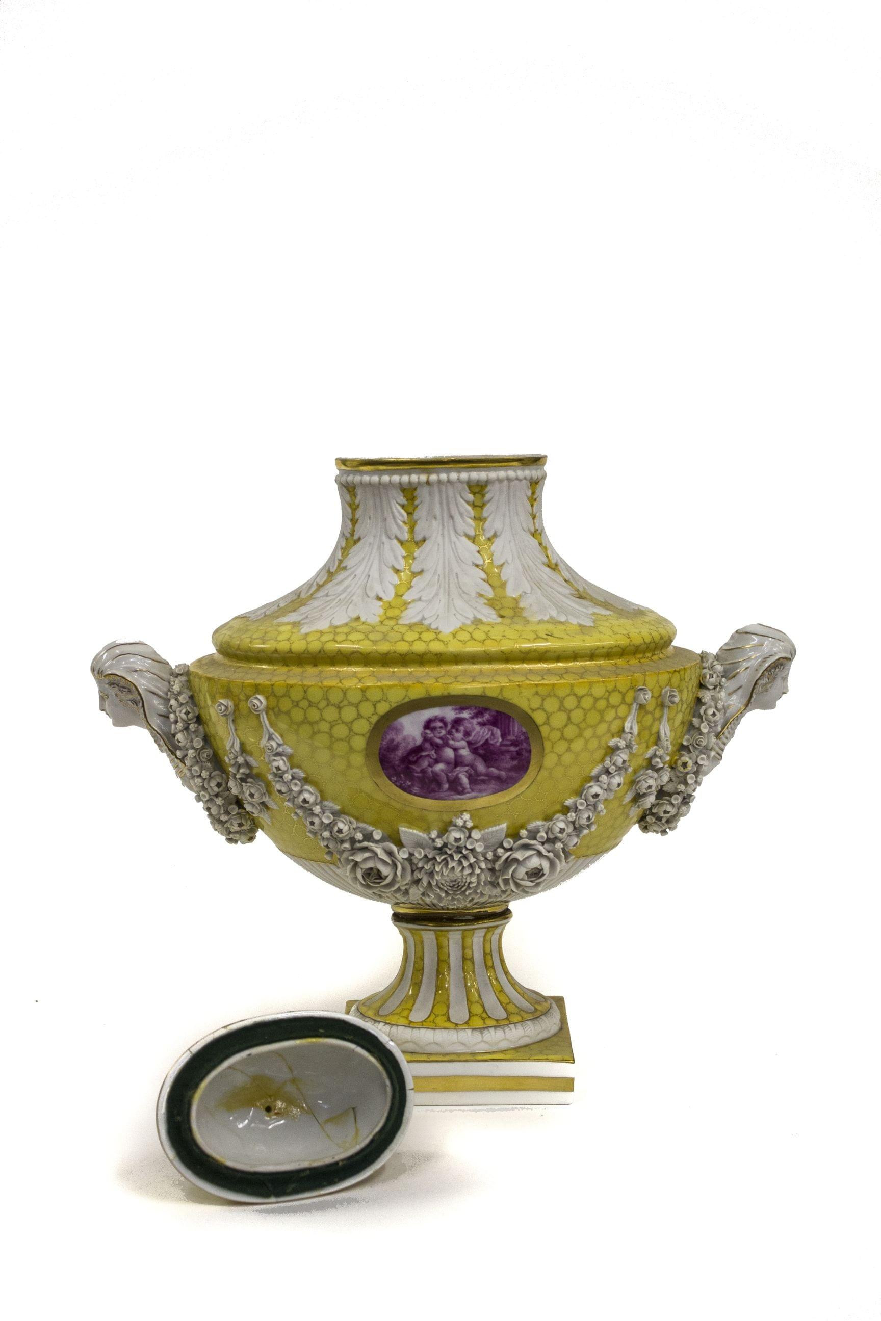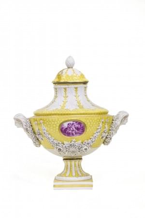A motif nid d'abeille jaune et or, médaillon pourpre figurant des putti en réserve, anses tête d'égyptienne soutenant des guirlandes, porcelaine, H 42 cm
