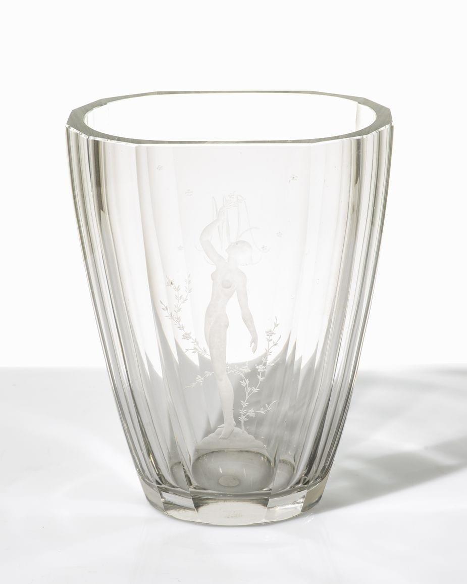Cristal, fond plat et parois cannelées à décor d'une femme nue d'un côté et des initiales AM de l'autre, H 28 cm