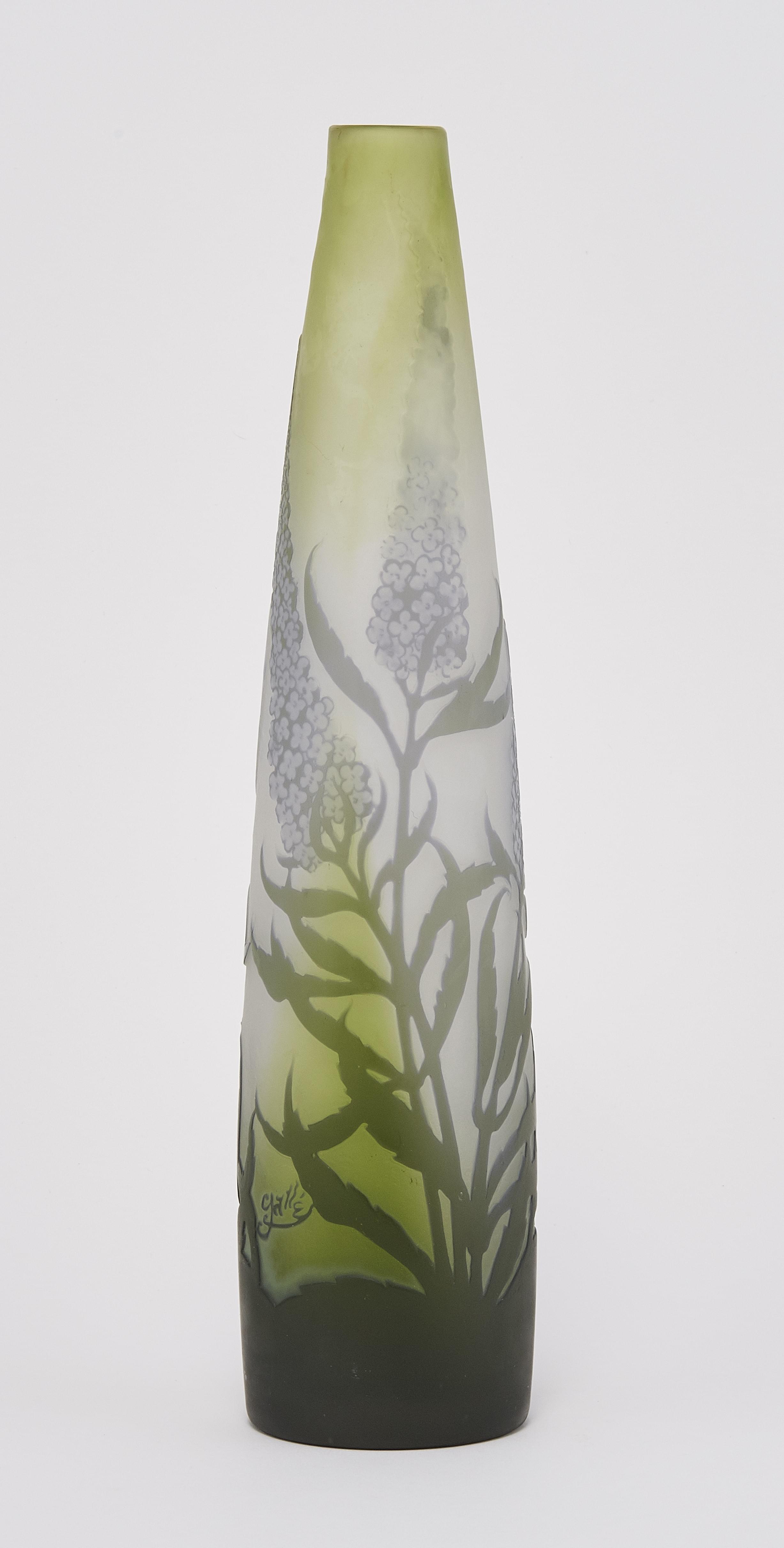 Verre multicouche dégagé à l'acide à décor de fleurs mauves sur fond laiteux, H 37 cm