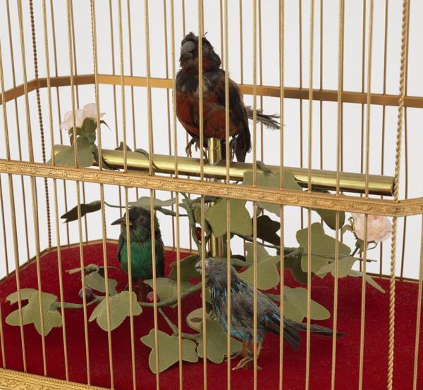 213. Grande cage à oiseaux chanteurs à trois oiseaux attribuée à Bontems, circa 1900