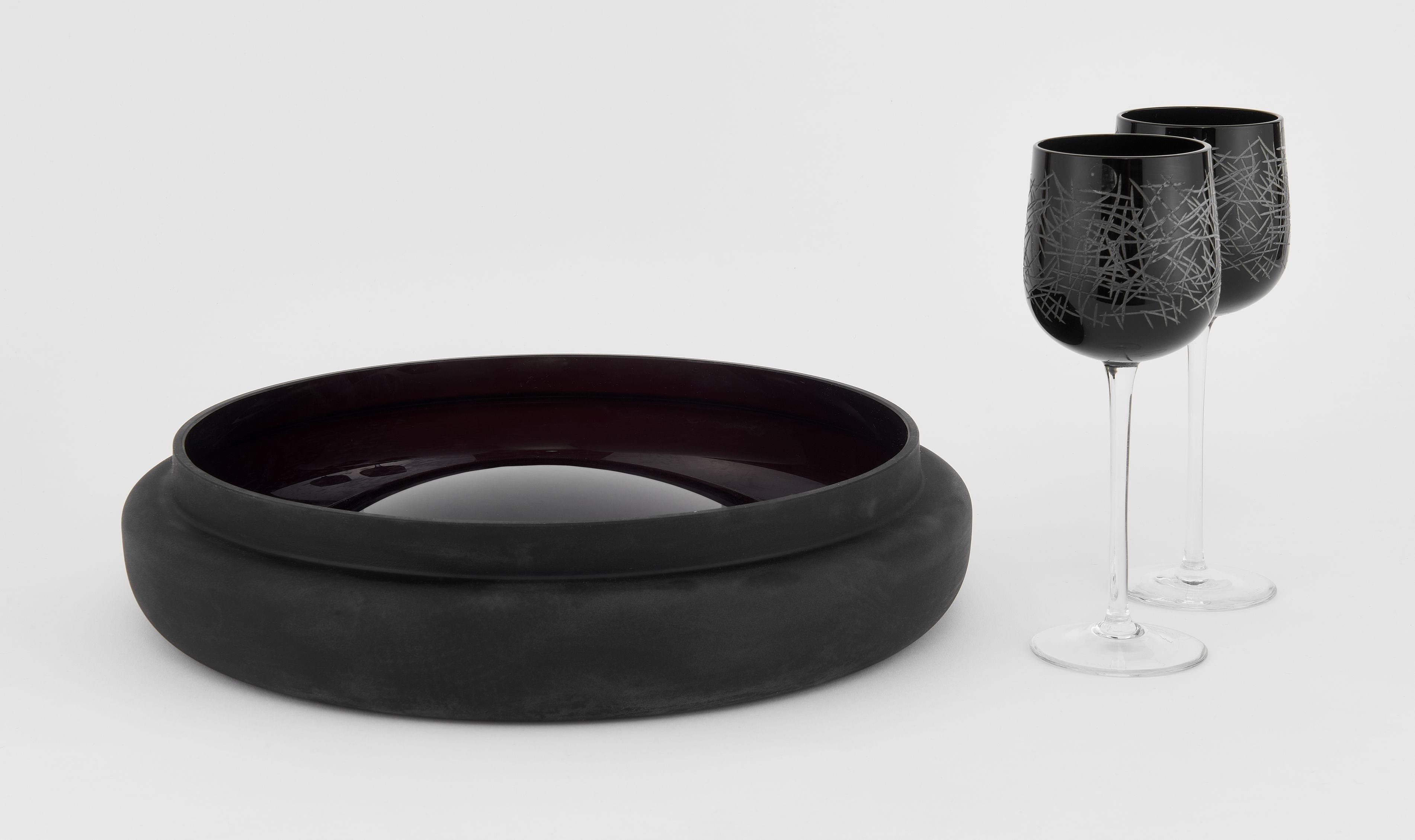 Verre opaque noir, D 35 cm. On joint deux verres "Twigs", verre noir.