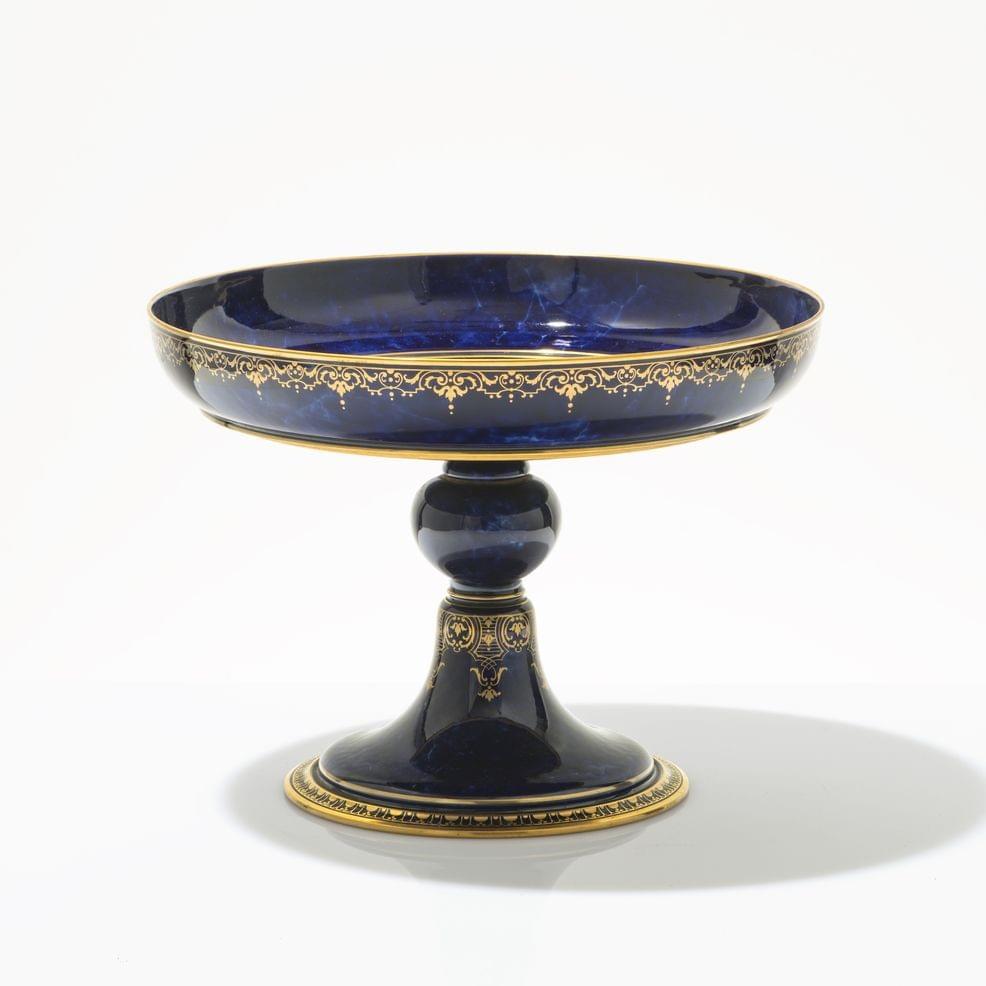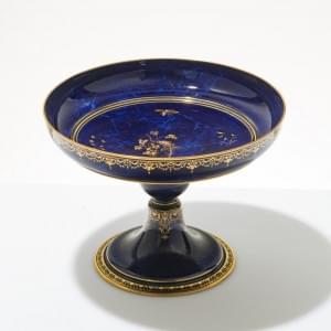 3180. Grande coupe sur pied bleu nuit et or à décor de lambrequins et abeilles