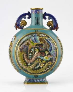 Email cloisonné à décor en relief sur les deux faces d'un dragon et d'un phénix polychrome, H 20 cm
