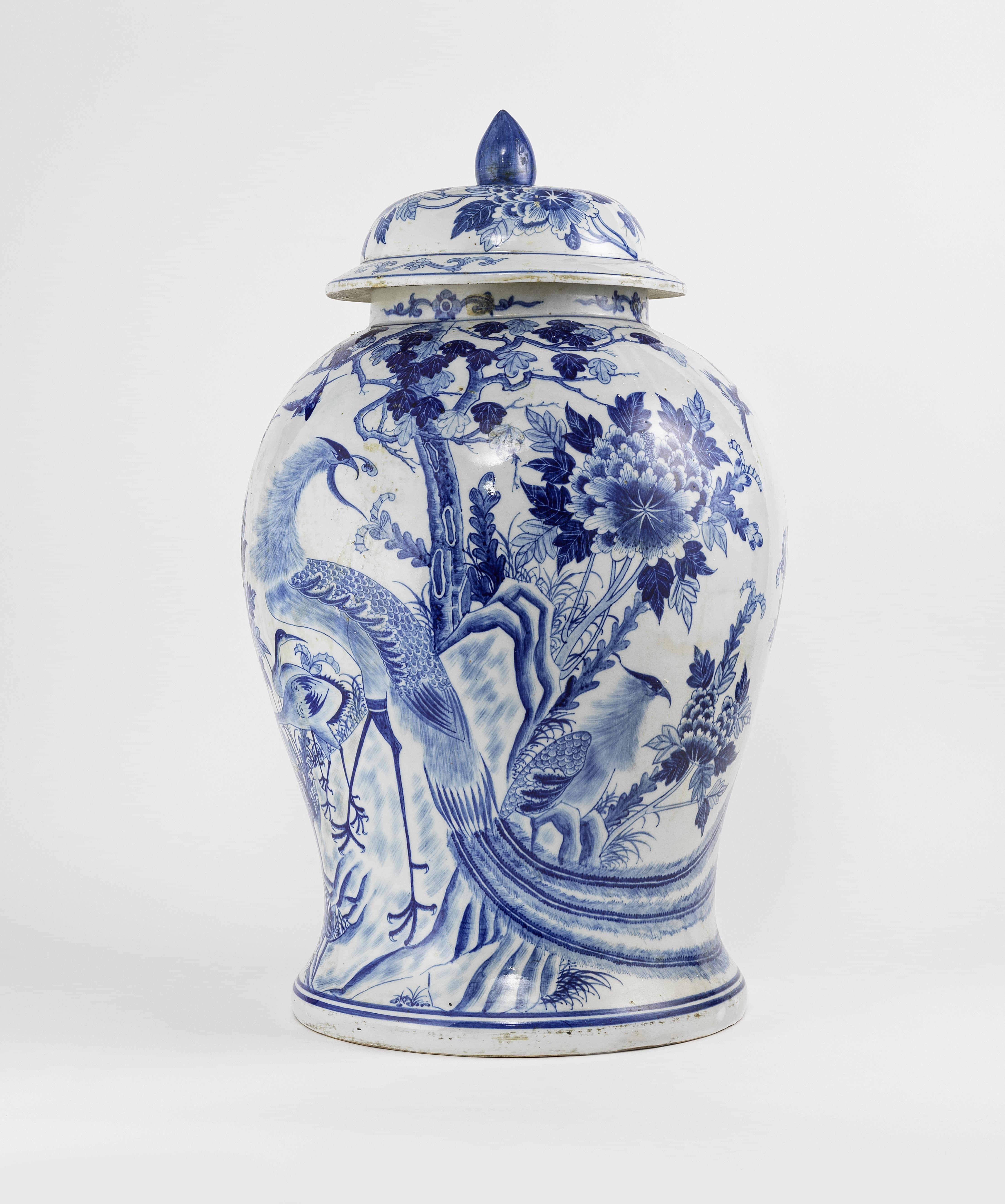 Porcelaine bleu blanc à décor imprimé et peint au pochoir de motifs de végétaux, H 50 cm
