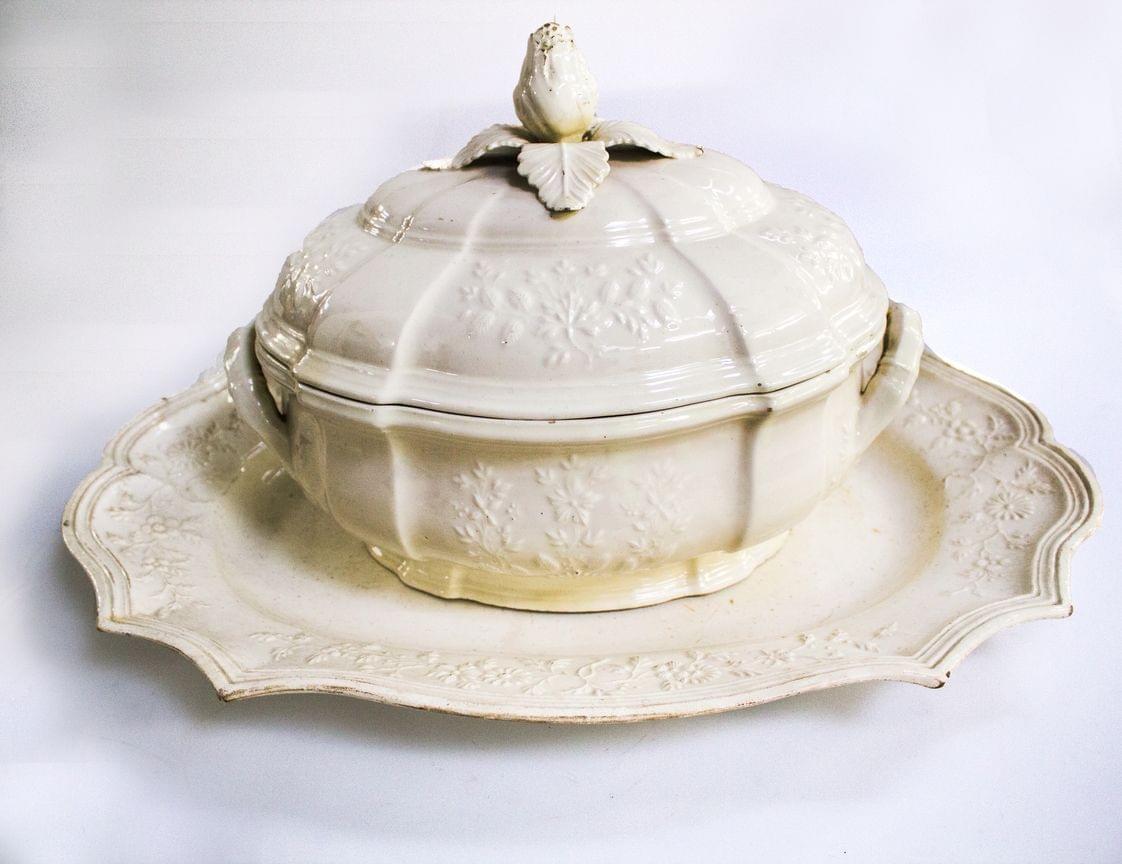 170. Soupière ronde néoclassique à bordure de feuilles d'eau et pieds...