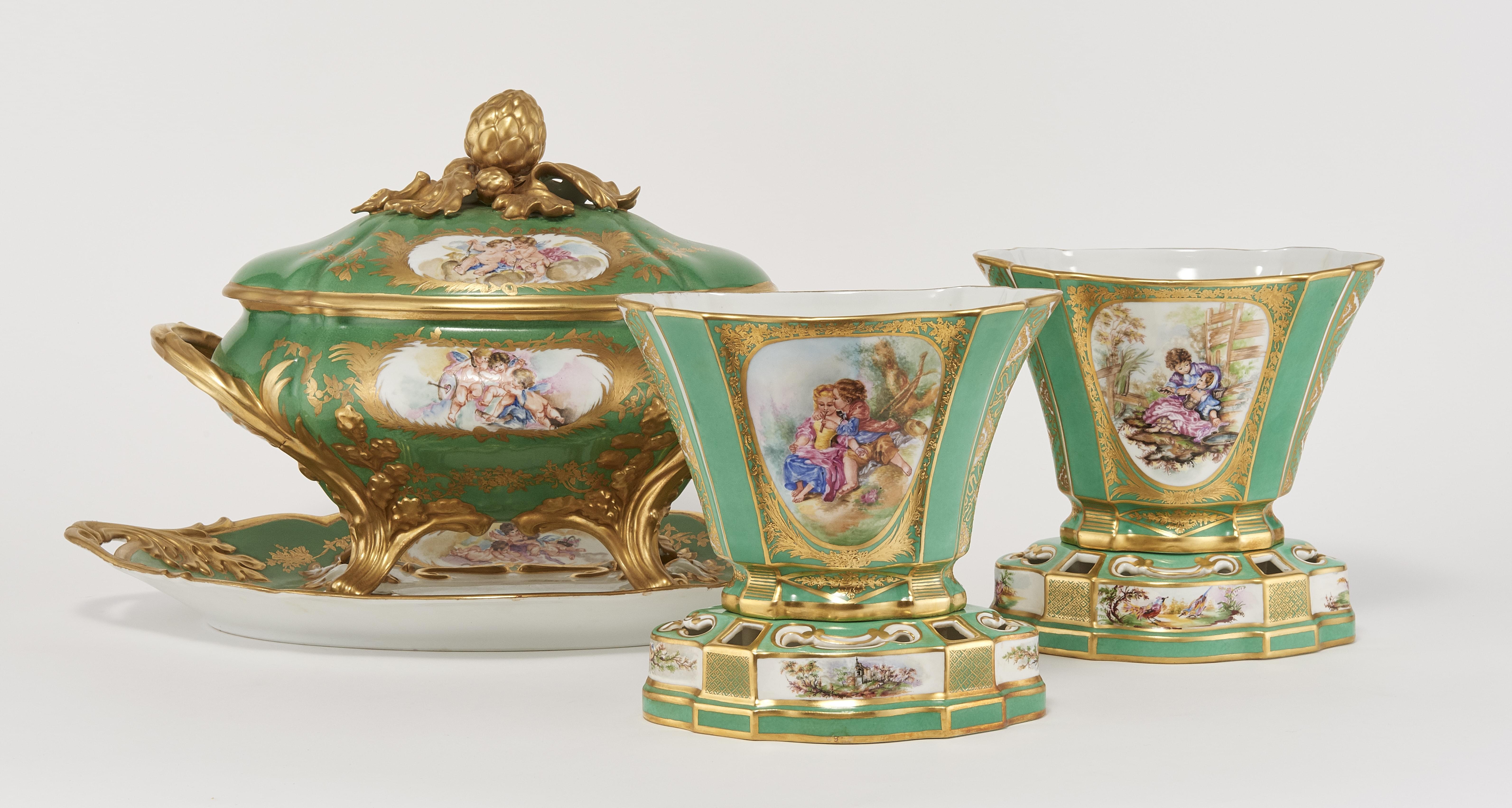 530. Grande soupière de style Louis XV et paire de vases sur piédouche à décor vert émeraude, scènes galantes et putti en réserve