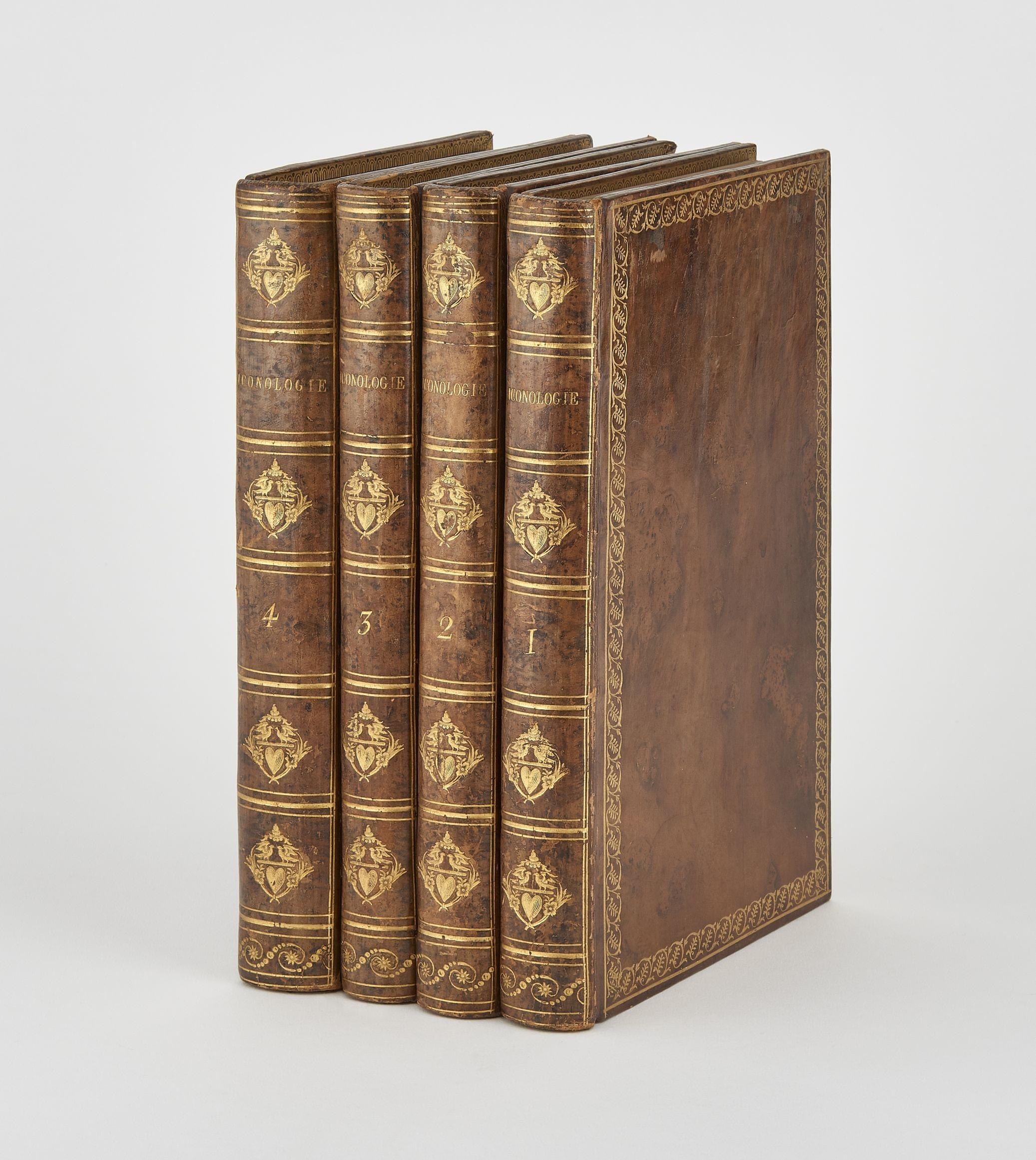 4 vol. in 8°, veau raciné, dos à faux nerfs ornés, frise dorée sur l'ext. des plats, tr. dorées. Reliure de COURTEVAL avec son étiquette, 2 portraits, 4 titres gravés et 202 planches gravées.