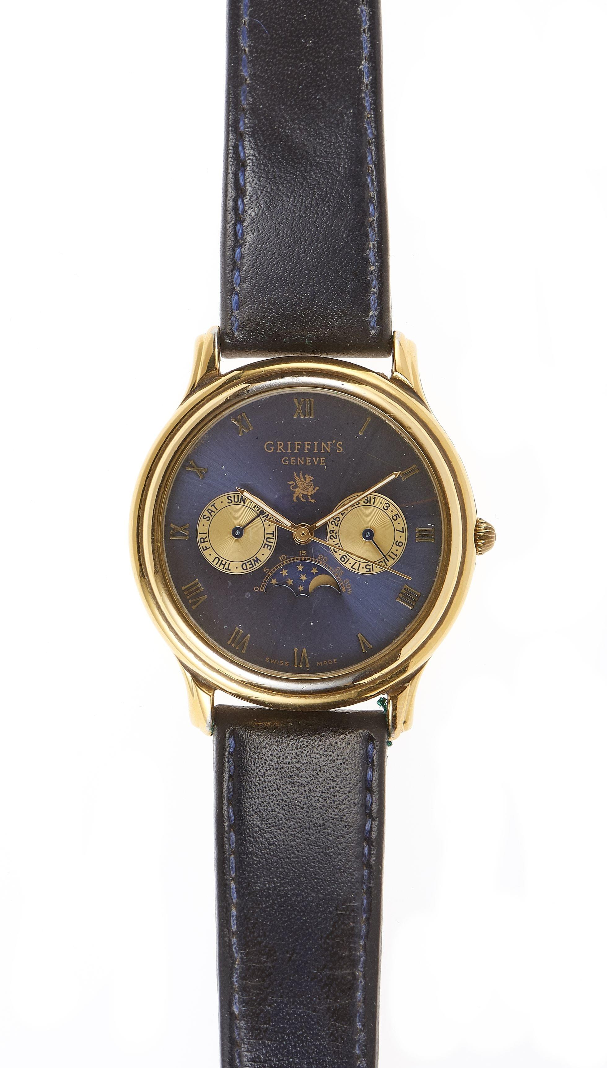 Cadran bleu, aiguilles et chiffres romains dorés, deux cadrans pour la date à 3h et le jour à 9h, phases de la Lune à 6h, plaqué or, D 35 mm