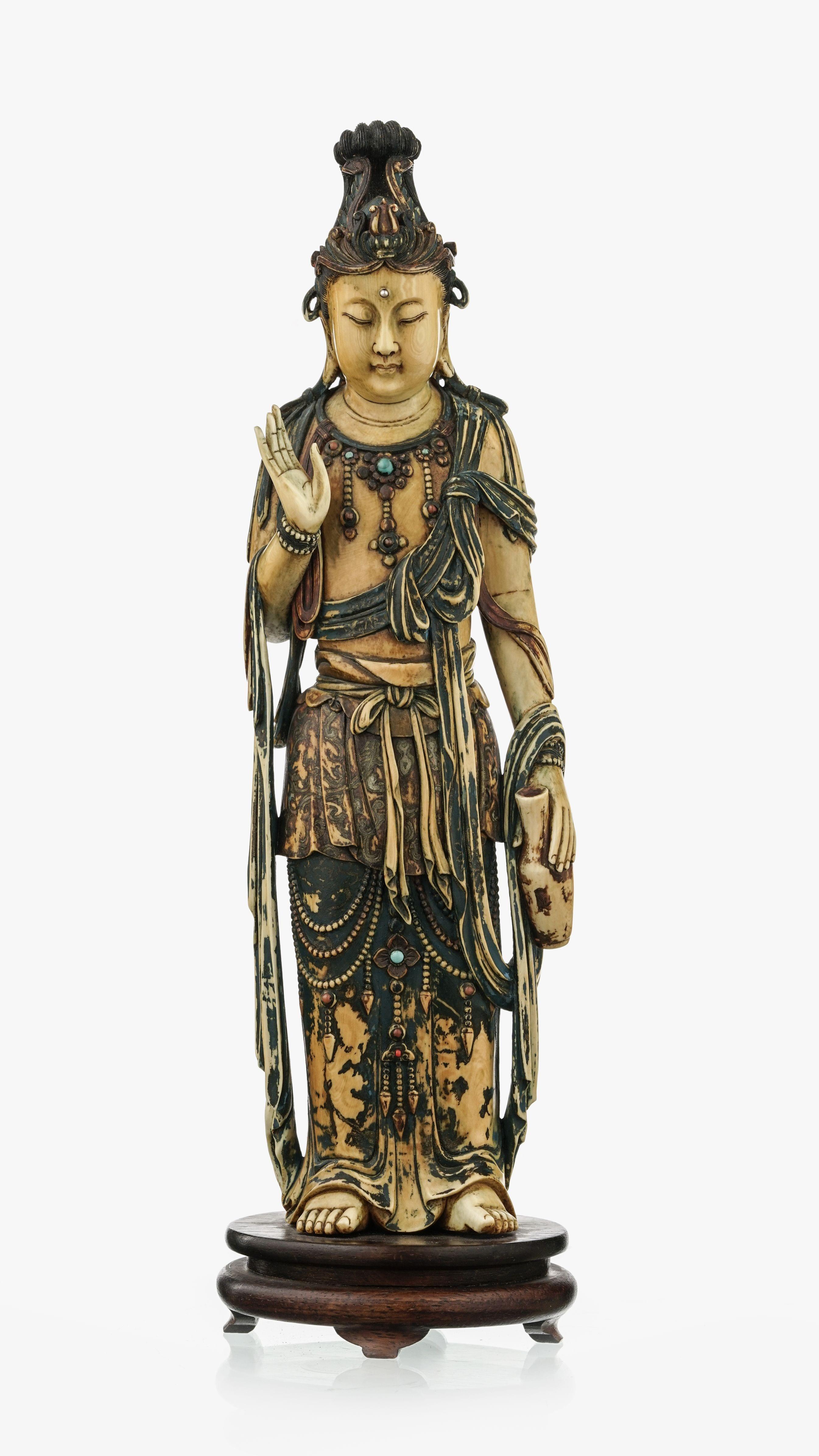 Ivoire sculpté et polychrome et incrustations de pierres, H 26 cm