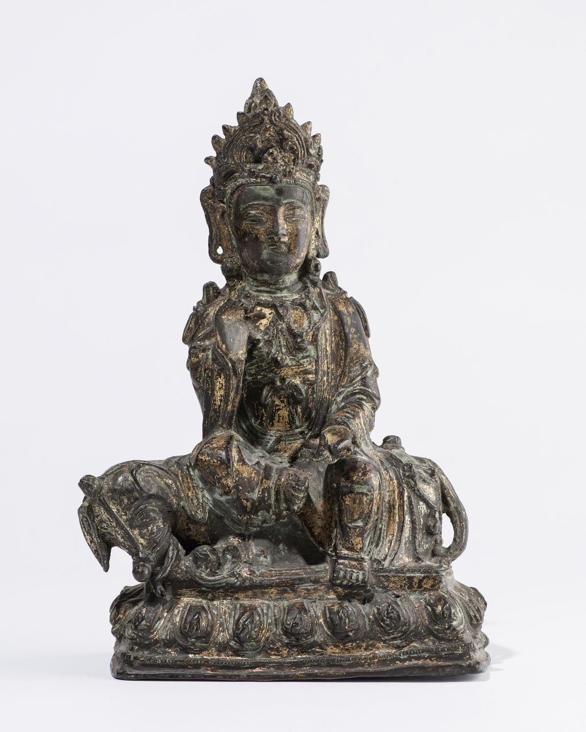 La main droite en abhaya mudra et la main gauche tenant un rouleau, bronze à patine brune, traces de dorure, Chine, probablement Ming (1368-1644), H 31 cm