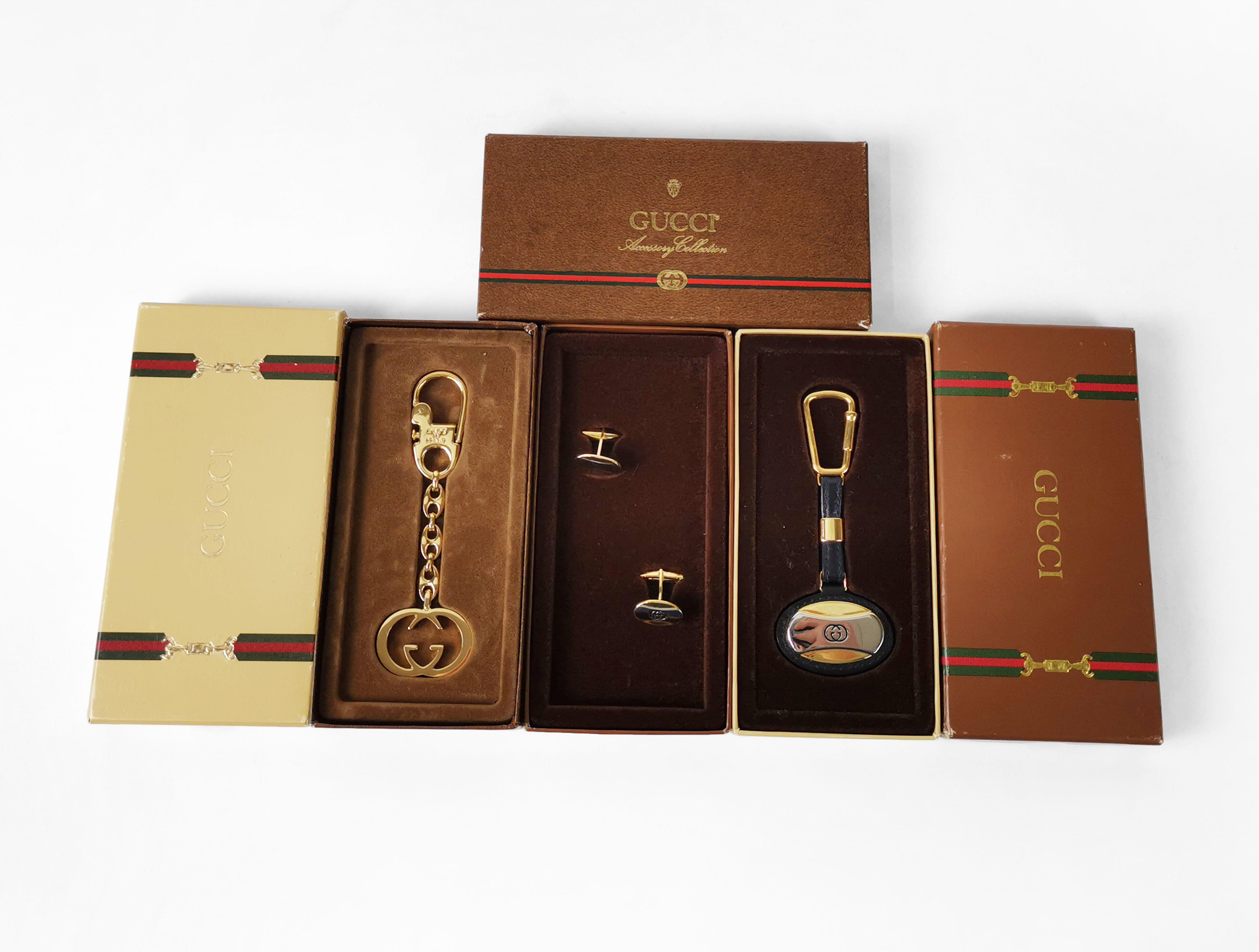 3686. Gucci, lot de deux porte-clefs et une paire de boutons de manchette