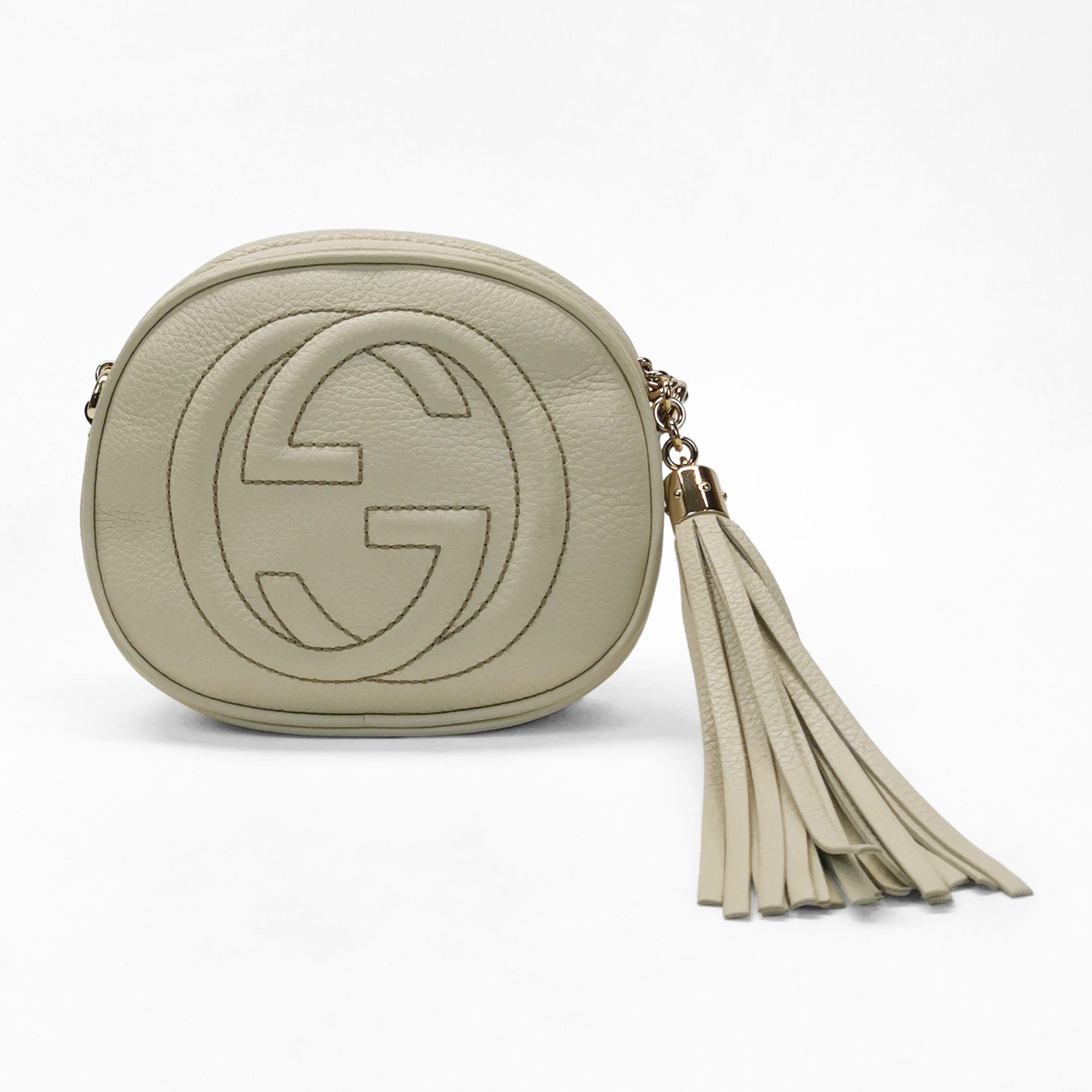 Cuir grainé ivoire, logo GG en surpiqûres taupe, bandoulière en chaîne argentée, fermeture zippée avec pompon, intérieur en toile beige avec une petite poche latérale, 17.5x14x5 cm