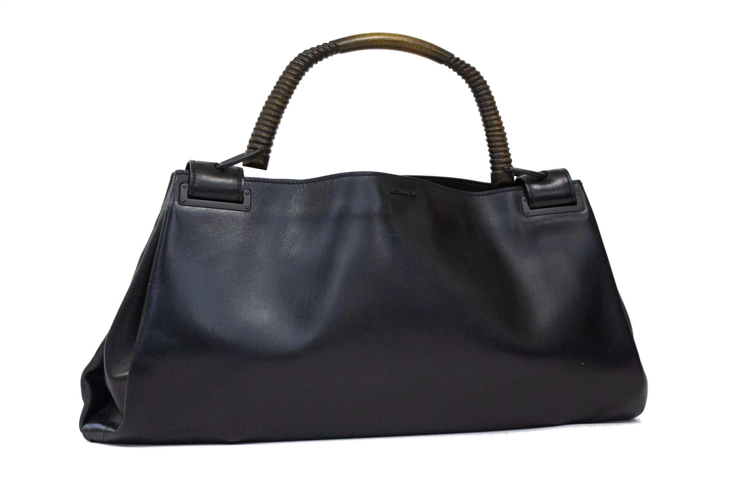 Cuir lisse noir, anse en bois sculpté, intérieur en tissu noir monogrammé, 25x54 cm