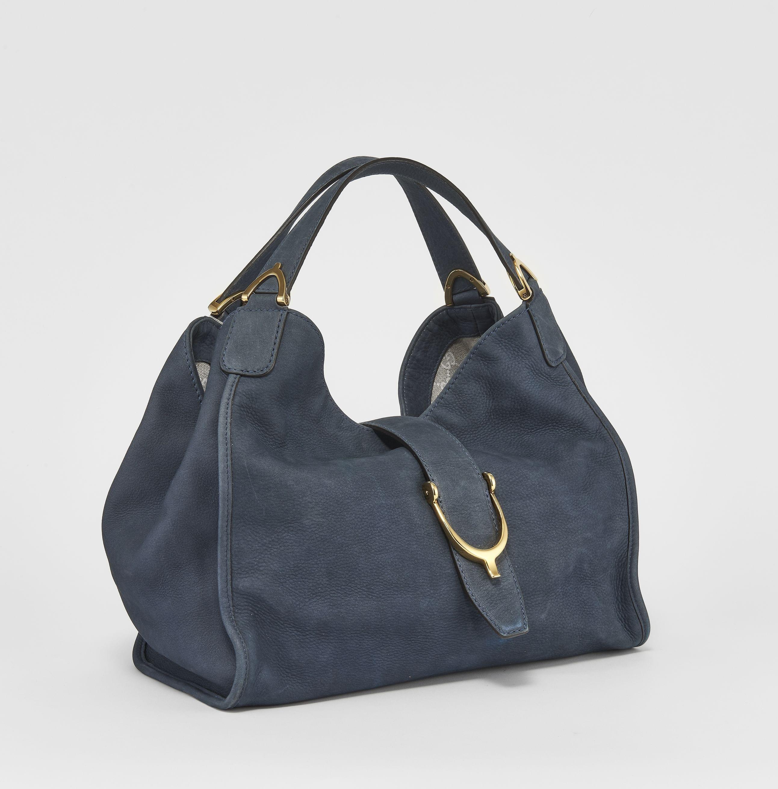 Cuir lisse bleu marine, garniture en métal doré, 23x32x12 cm