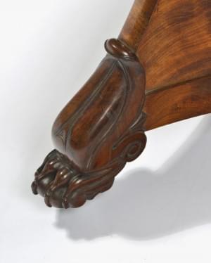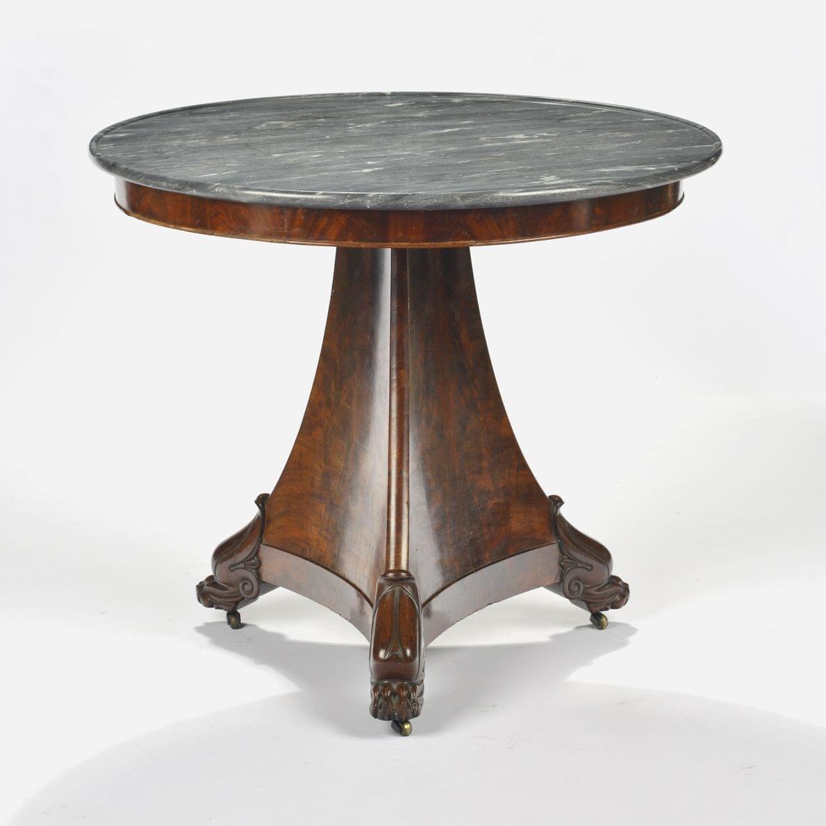 Piètement tripode à pieds griffes, acajou et marbre gris, D 86 cm