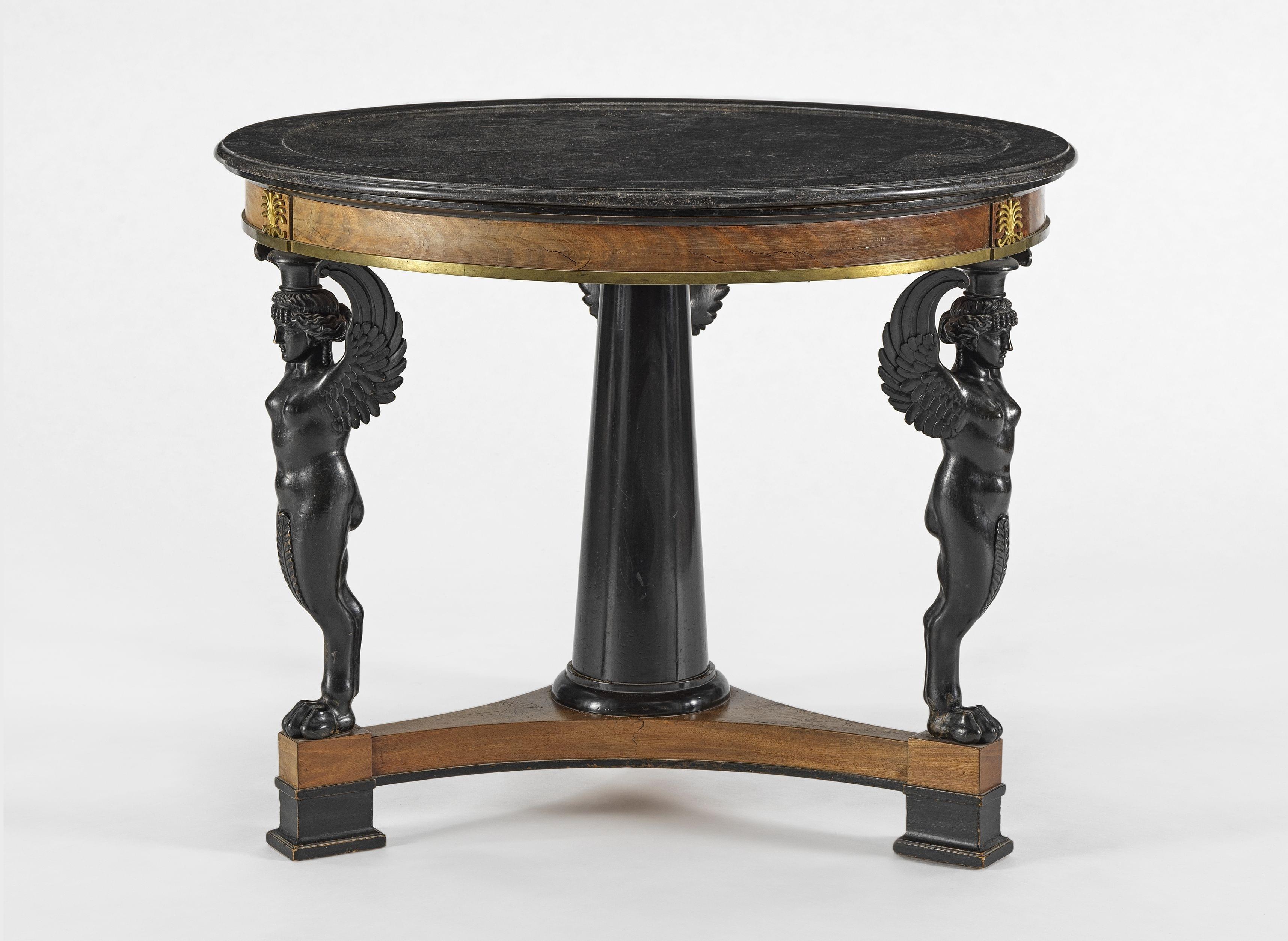 Montants en sphinges ailés, bois noirci, acajou, bronze doré et