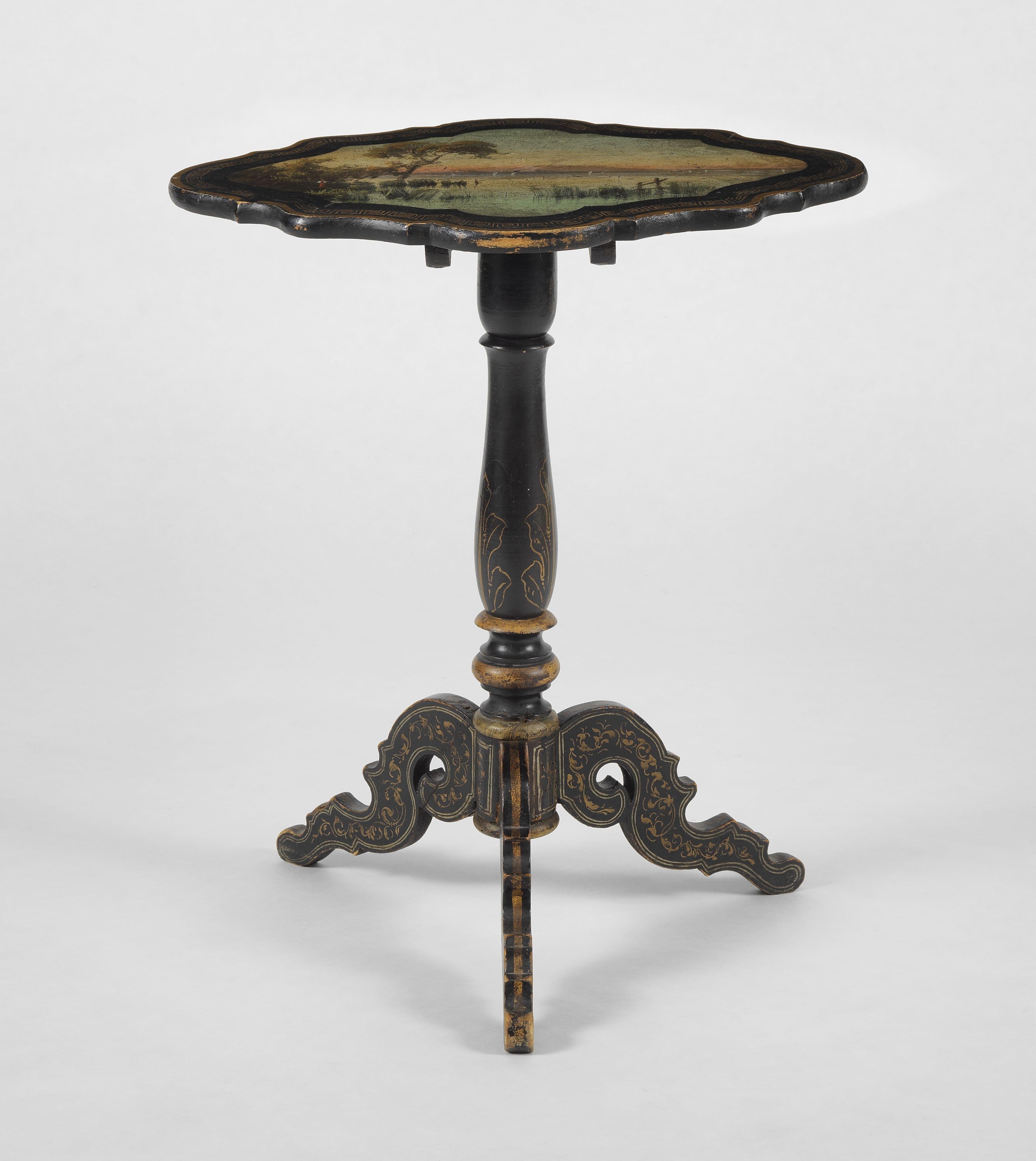 Bois noirci et doré à décor peint d'un paysage lacustre animé, 70x60x45 cm