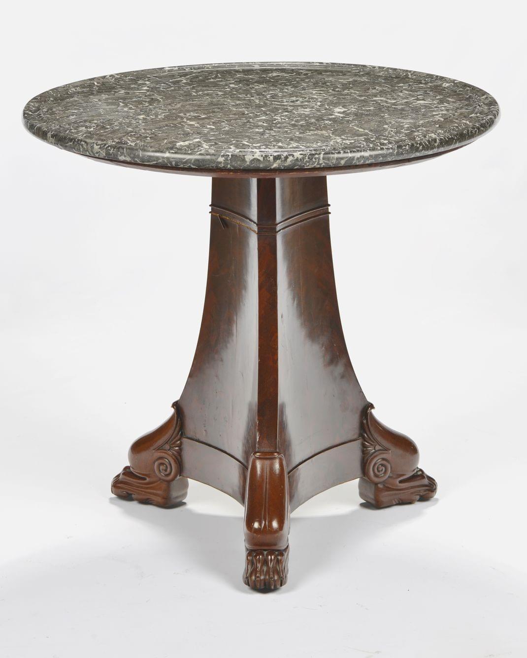 Pieds griffes, acajou flammé, marbre gris Sainte-Anne à gorge, D 80 cm