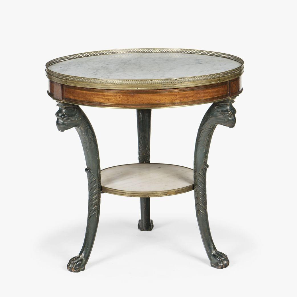 Ceinture incrustée de filets de laiton, triple piètement en tête de griffon terminées par des pieds griffe, tablette d'entrejambe, acajou, bois patiné vert, laiton et marbre blanc, H 74 cm, D 72 cm