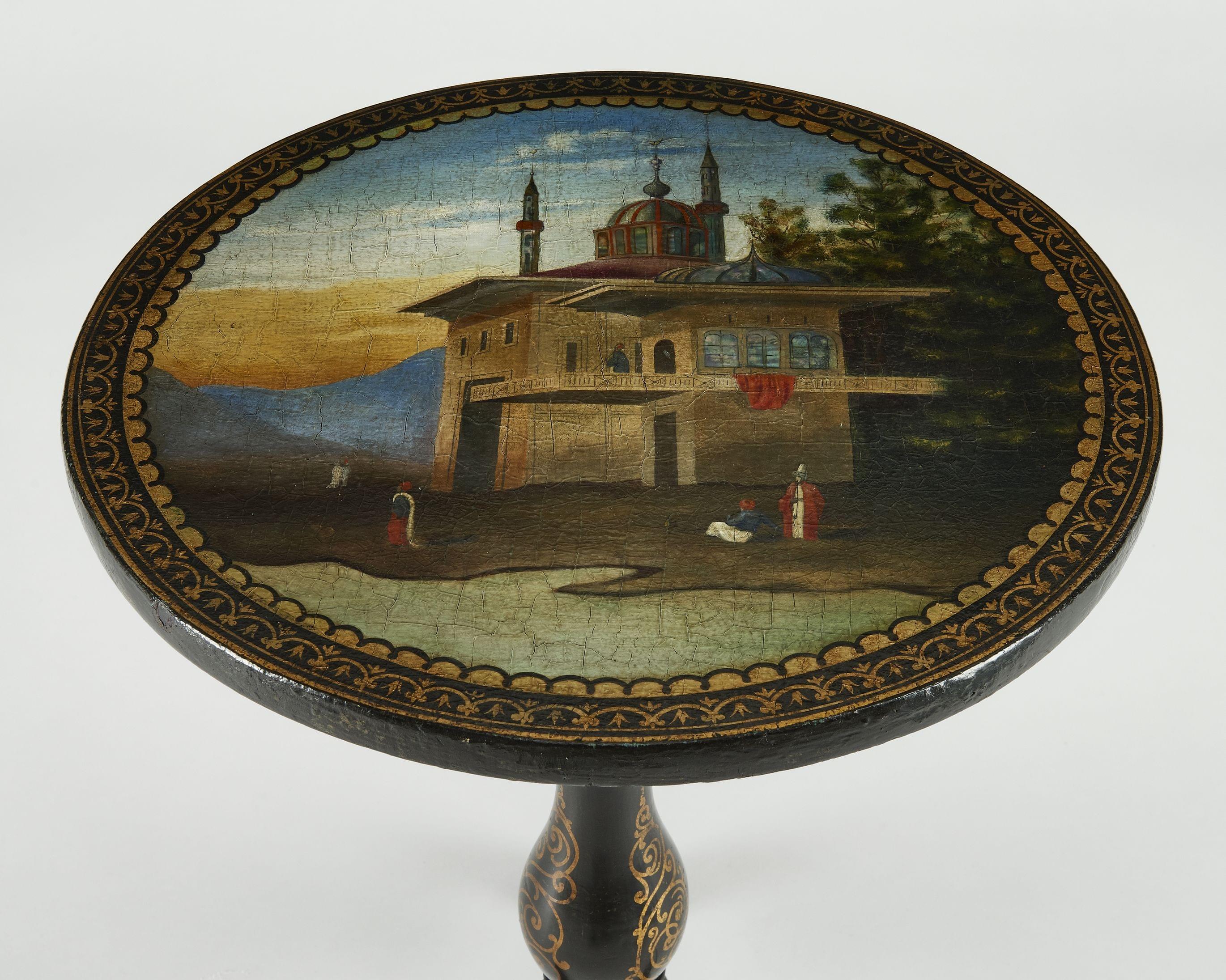 Bois noirci et plateau peint à décor d'un pavillon oriental, 71x45 cm