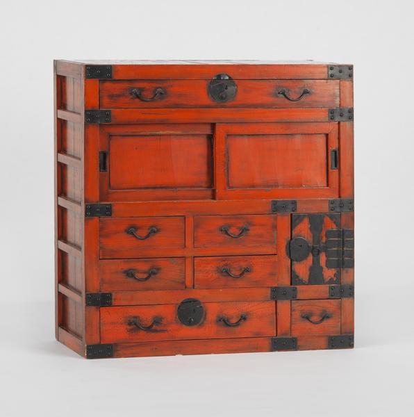 Bois laqué rouge, multiples tiroirs, 90x87x38 cm. Provenance : c...